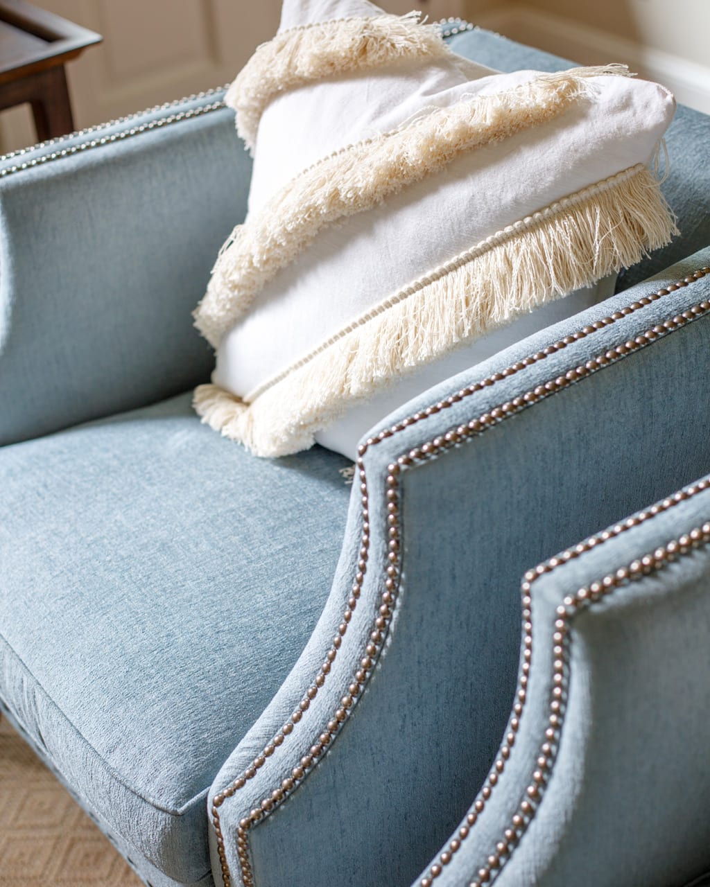It’s important to know how the scale of furniture will work in the room, along with the way color and pattern will move the eye around to each piece. To keep the space from feeling matchy matchy, we chose a variety of blues from cornflower to spa to navy. Mixing them all together gives the space warmth and layers.