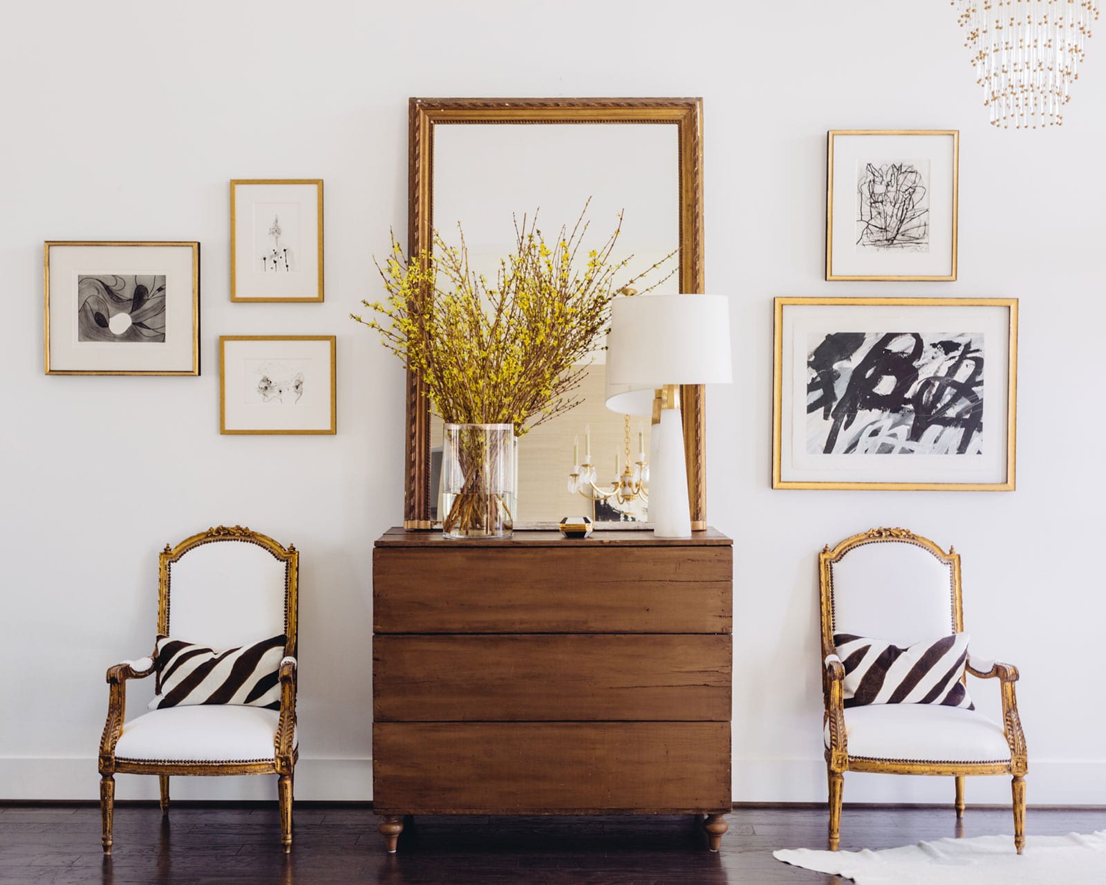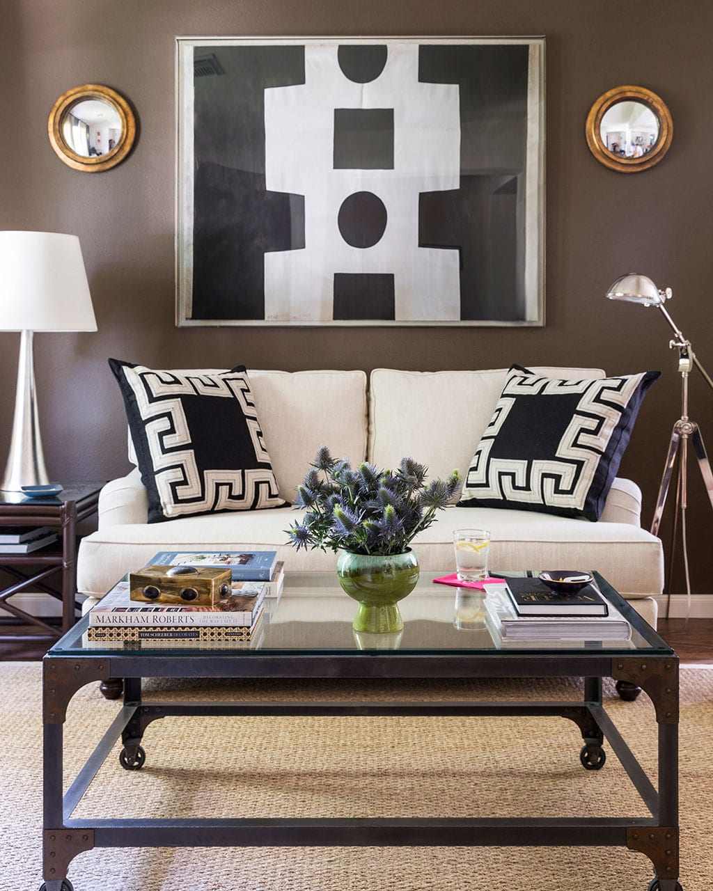 You might also consider adding some round pieces into the wall. Paloma likes to add small, convex mirrors and hang them above the art on the outer edges. You can create symmetrical arrangements of art and mirrors above the ottomans on the end of console.