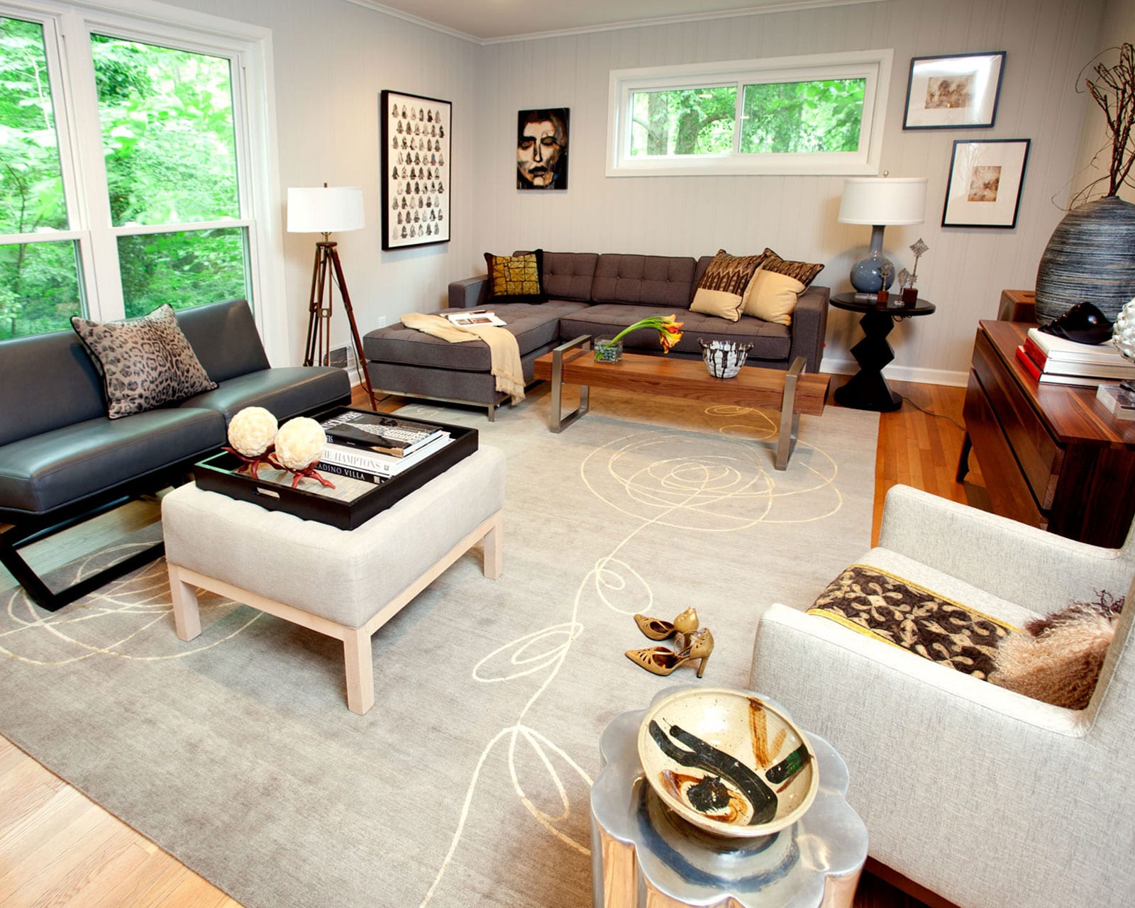 Laura isn’t a fan of layered rugs. It’s often a tricky look to pull off. Instead, she suggests doing one long rug that fits the whole room. Find a local carpet store, and they’ll be able to make a custom sized rug for you. It can fit right around that fireplace hearth, creating a U-shape. The word ‘custom’ implies super expensive, but depending on the type of carpet you choose, it might not be any more expensive than buying two separate rugs.