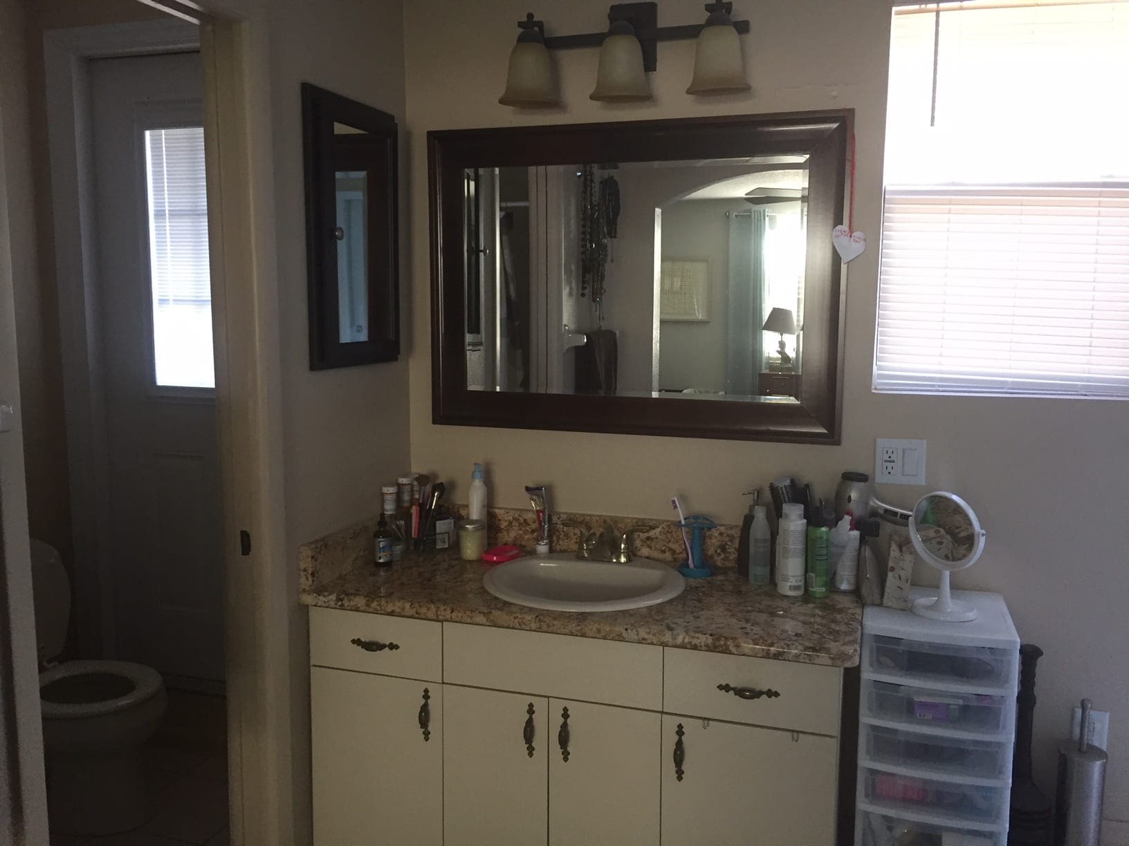 Gutting your bathroom is going to be a big project, so I get that you may not be ready to pull the trigger just yet. If it were me, I’d do some small fixes — basically paint everything white (the mirror frame and vanity) and bring in some new fluffy towels — just to help neutralize the space. Hang some curtains on the outside of the bathroom in the bedroom so you can block off the room when you aren’t in there. For me, I wouldn’t want to constantly be looking at a bathroom I hate, so adding drapery in the interim might help reduce the visual clutter.