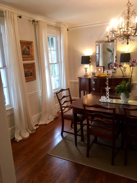 Julie and Michele also recommend maybe taking a risk in either the living or dining room with patterned drapes. They also suggest trying a narrower rod, something slightly more delicate. Also, bring your same living room panels over to the fireplace wall so keep them consistent.
