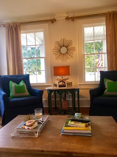 - The table in between the two blue chairs-I think the scale of the lamp is correct, but what do y’all think? However, the lamp itself does not work at all with the room. Any ideas? Something about that little vignette is off to me.