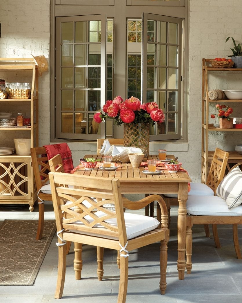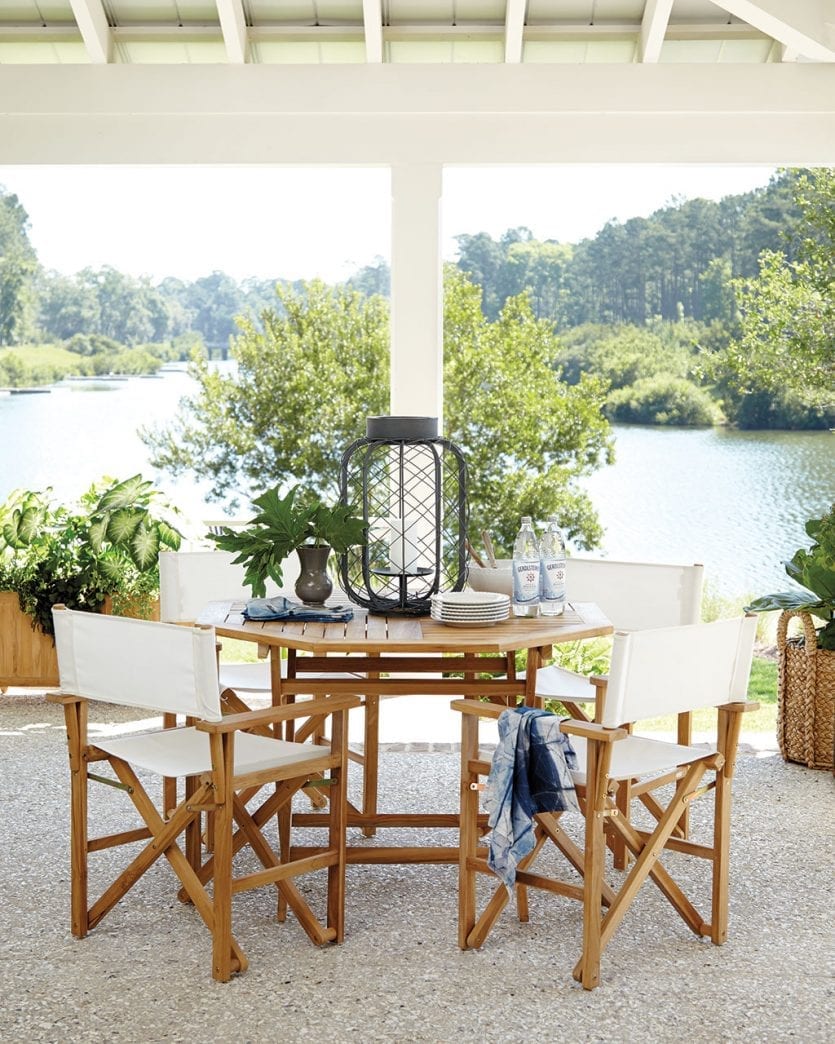 If you’ve got a beautiful landscape or a fantastic view, keep outdoor furniture neutral. We love these two spaces just for that reason. Our Amalfi outdoor furniture and Suzanne Kasler’s teak campaign chair are certainly chic but they don’t upstage the main event.