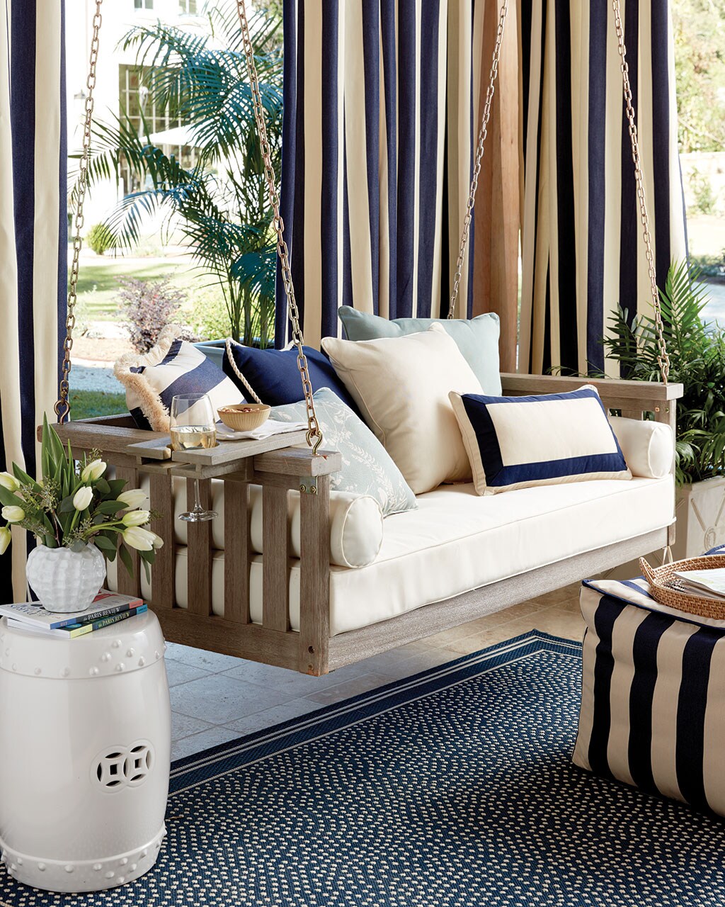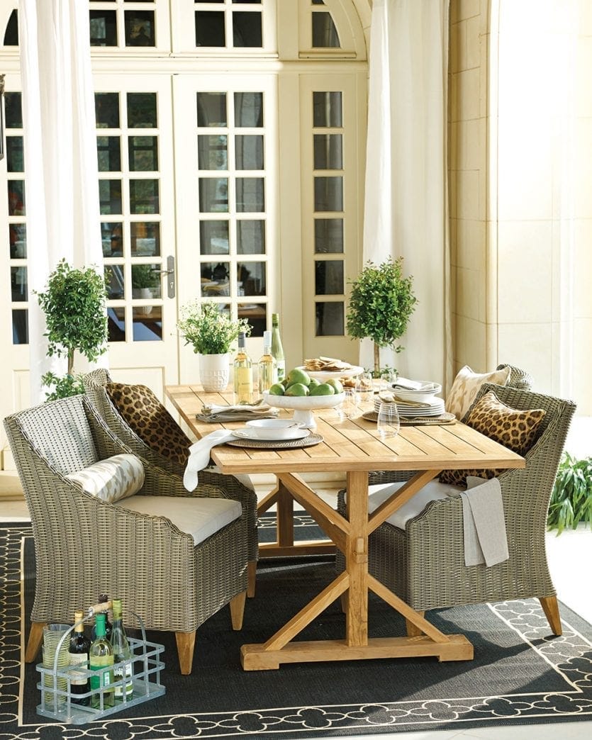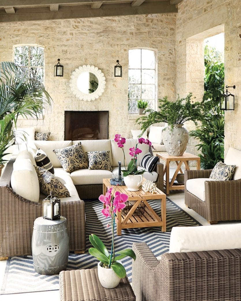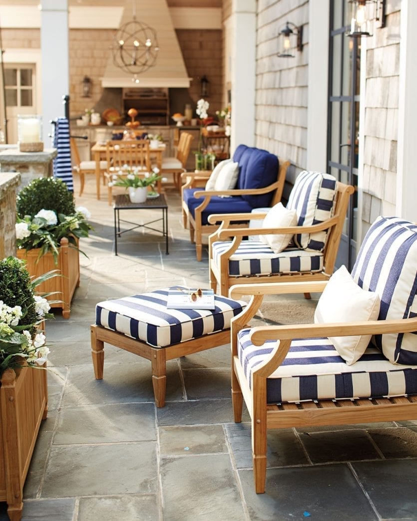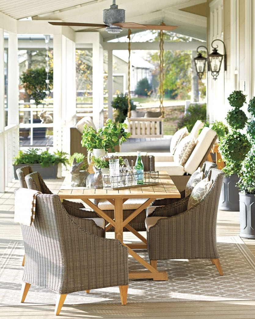 If you’ve got a long, narrow porch or patio, break it up into smaller seating areas. Here, Suzanne Kasler used her Directoire collection to create two large seatings areas that are mirror images. Plenty of comfy pillows and coffee tables for snacks make this a space you’ll enjoy for reading, entertaining, and maybe even napping!