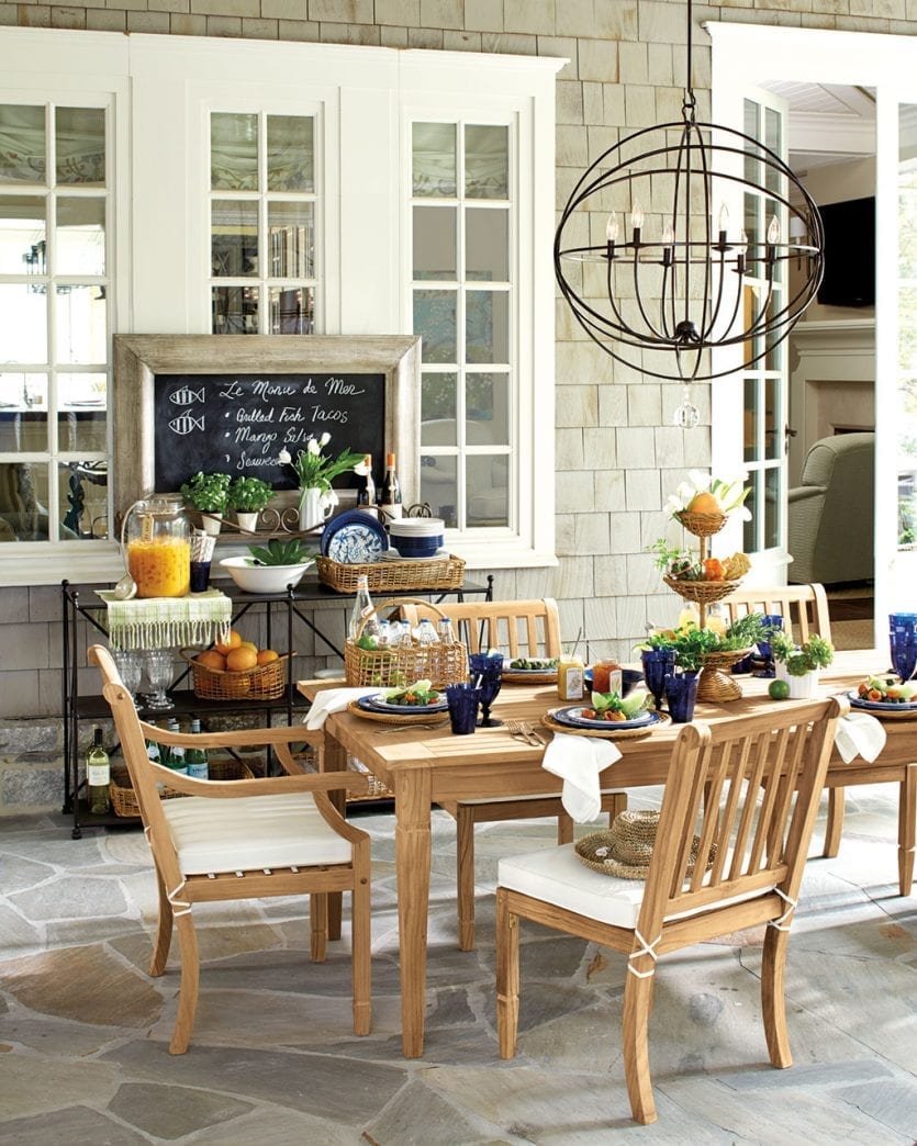 Don’t forget to set the mood with outdoor lighting. Hanging string lights, a great chandelier on a covered porch, or wall mounted lanterns are a great way to make sure your outdoor space has plenty of light and you can relax even after the sun goes down.