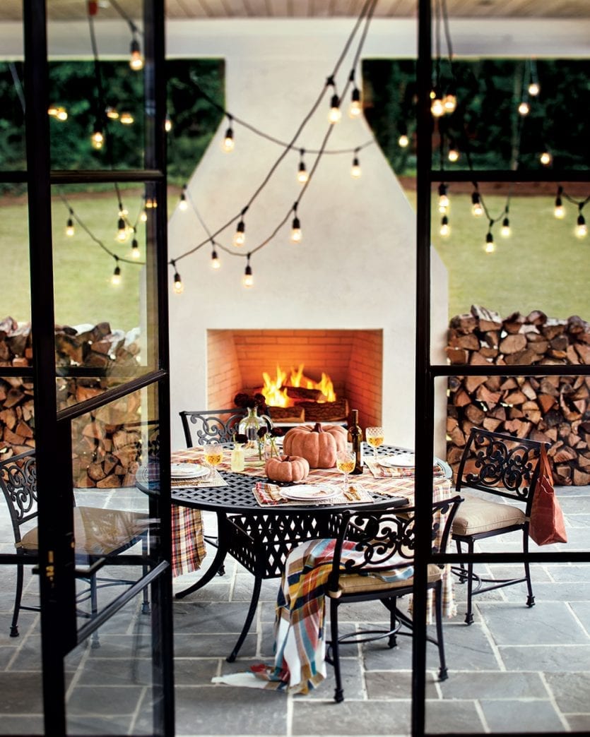 As the weather cools, there’s no reason you can’t keep using your outdoor space. Bring in a freestanding fire pit or strike up a crackling fire in your outdoor fireplace. The key is not to forget all of the accoutrements — throw blankets, candles, and other cozy details to draw you outdoors.