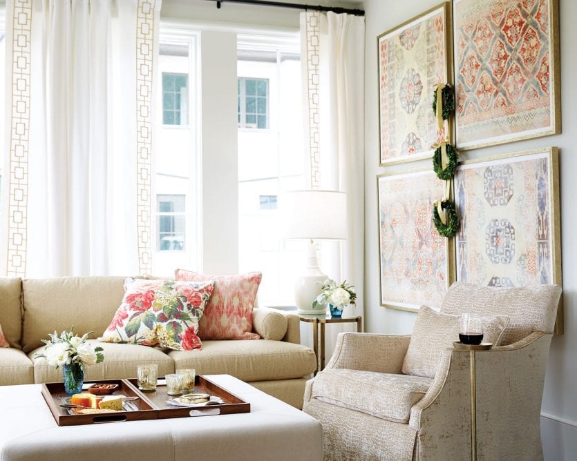 The gatherings around our table from November through January are plentiful, festive, and welcome. That’s why the simplest way to incorporate a topiary is on your dining room table. A big bowl of faux greenery in the middle of the table, chic potted ones on the sideboard, and even hanging wreaths from window sills make the prettiest backdrop.