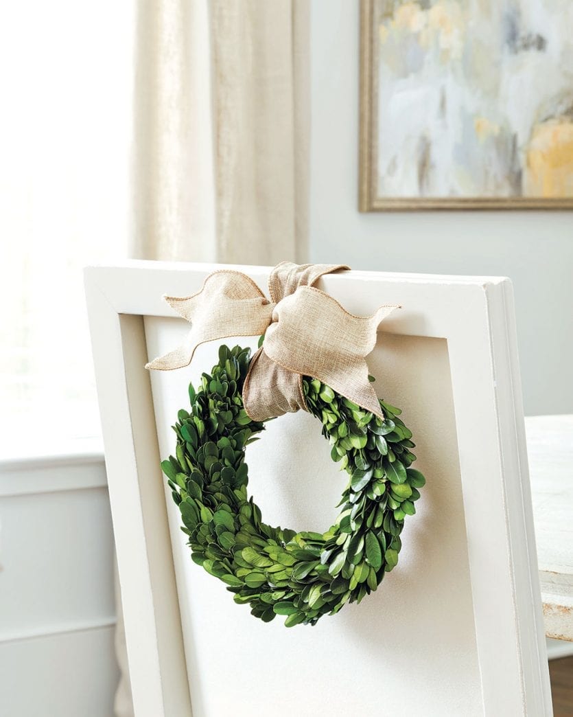 Topiaries in wreath form might be our favorite use of greenery. Dropped with a simple, festive ribbon, you cannot go wrong. They work especially well when left to hang from existing art or furniture.