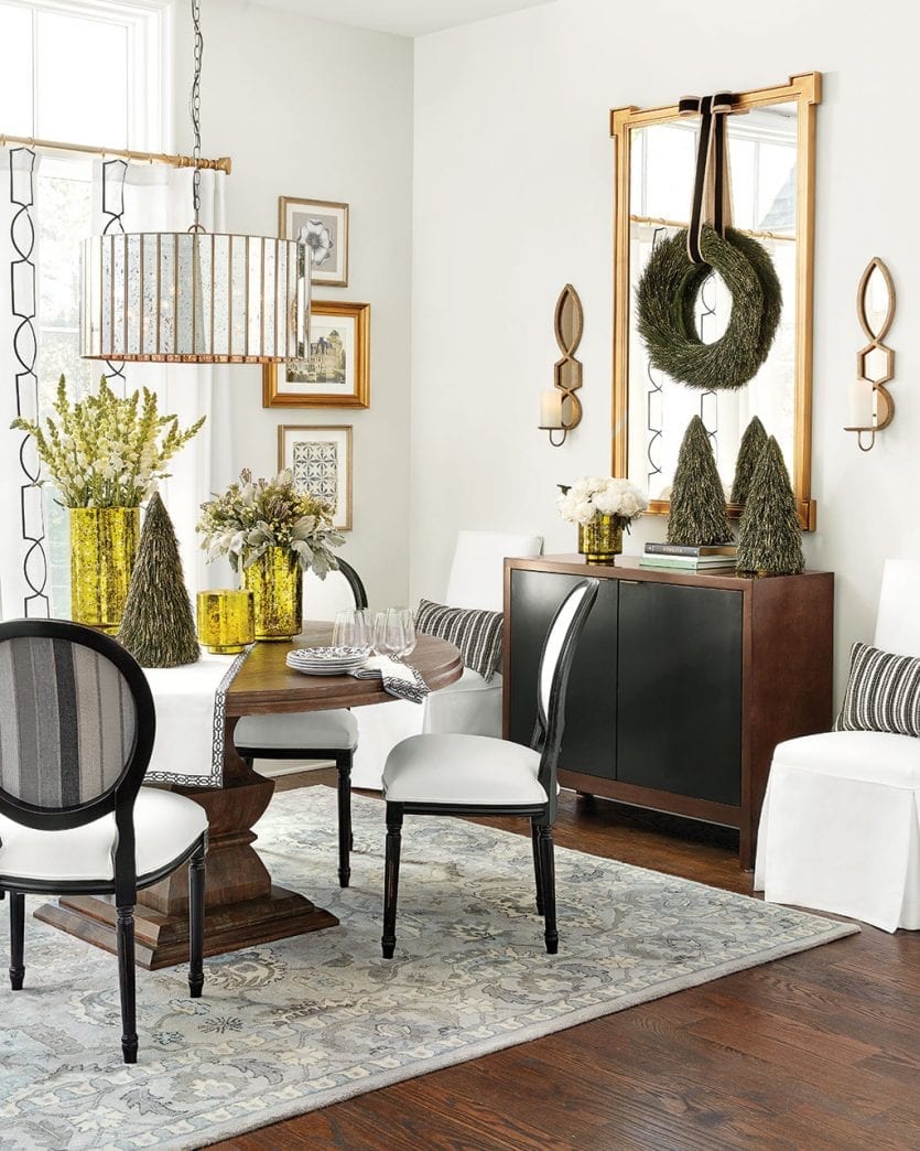 Pops of green throughout the dining room are stunning against your holiday table runner. For added interest, play with varying heights of your topiary.