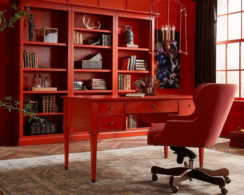 Not every room has great natural lighting, and if you’re working with an already dark space, it often makes more sense to embrace that dark, moodiness. In the two rooms above, we chose a monotone color palette in rich sapphire and vibrant fire opal red.