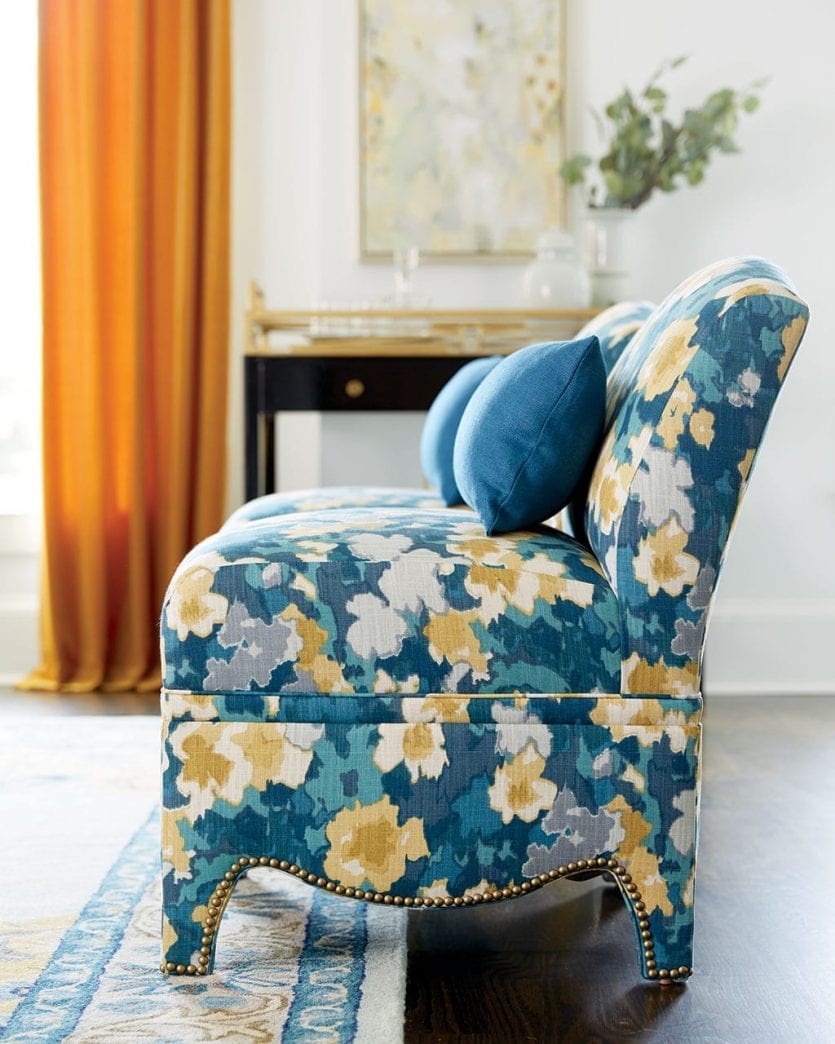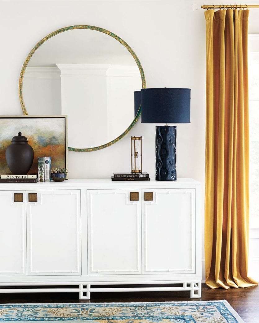 What’s better than one jewel in a room? Two! Consider pairing two gorgeous jewel toned colors together to create a high impact color palette that adds richness to a light, bright living room. Here, we wove elements of sapphire and topaz together, with plenty of gold and velvet.
