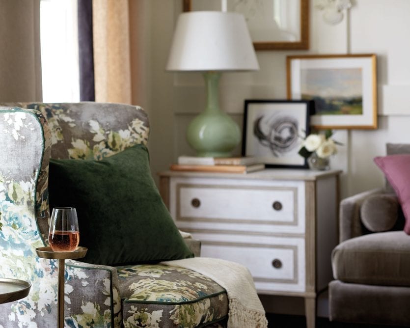 In the room above, we chose accents of emerald, peridot, and amethyst to bring richness to a living room. Notice that the main elements in the room are neutral — a gray velvet sofa, white case goods, and gold accents. But a few pillows, a vibrant chair, and small decorative touches bring a richness to the space that pastel pieces would not.