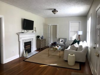This whole space is off to a really great start! We recommend getting one of our round dining room tables and a few more of the Dayna chairs. We need to come up with a plan to camouflage the chords, whether it’s a cable box, taping them to the side, or hiding them within books. The light fixtures can be upgraded, and maybe one by the TV and the dining room table. Two different lights are fine, and adding a pop of green would go great in this setting now. Get some beautiful new woven blinds, and a fun pattern all around will help unify and tie together the look. A rug in the dining room would show the great size of the room. A big mirror, lamp, or art would look great above the chest.