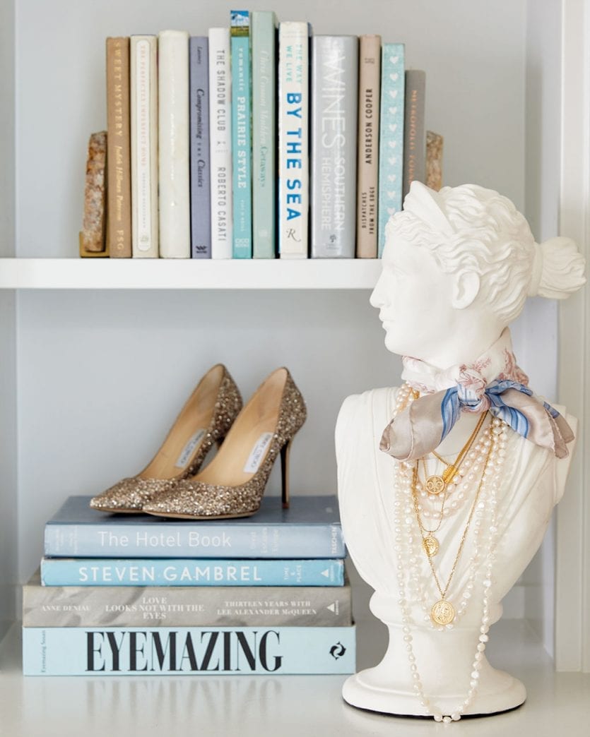 CC: There are little touches of fashion throughout the space, which I really love. For instance, we have a pair of my blue suede heels on our built-in-bookshelves, and we dressed up this mannequin with a few of my pearl necklaces. And of course, there are some fashion and style books on the mantel.
