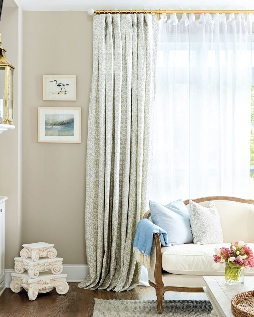I’m looking at the blog on Caitlin Covington’s living room . What color is her wall paint, where’d she get her curtains and lastly, the two little art pieces by the window- are those from Ballard!