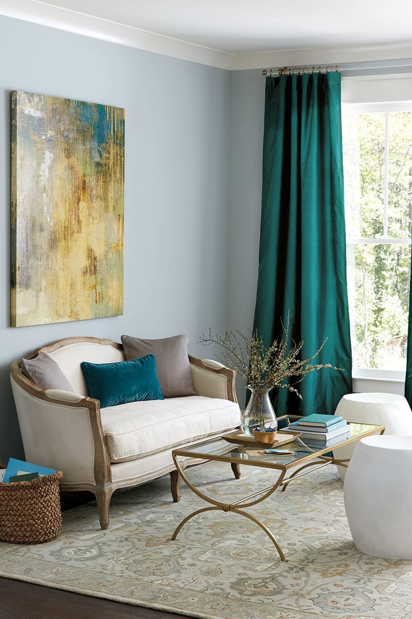 Every room needs window treatments, so why not use them to make a statement? Our Dupioni Silk Drapery Panels in Peacock feel rich and so luxurious in the corner of this seating area. They’re the perfect way to add punch to neutral foundation pieces, wouldn’t you agree?