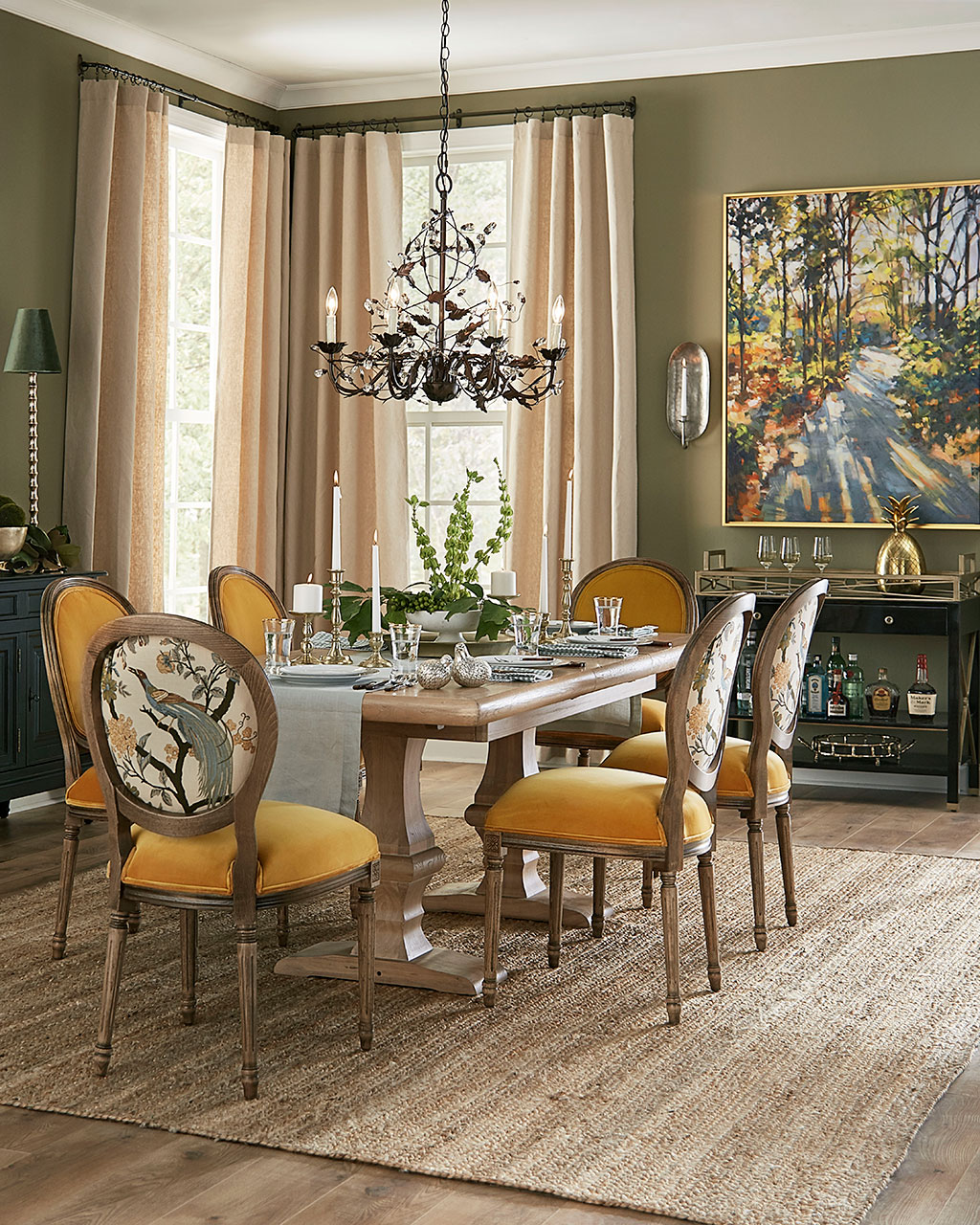 I love the top picture with the Sunlit Stroll canvas. I have purchased the exact dining chairs shown in that picture. Would you happen to know the color of the paint in that dining room? I’m wanting to mimic almost everything in that dining room.