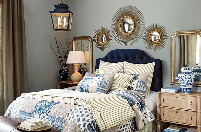 We’d be remiss if we didn’t talk a little bit about metallics while we’re on the subject of jewel tones. Just like your favorite pieces of jewelry, golds and silvers are the perfect complement to saturated sapphire, emerald, and ruby-colored hues. In this bedroom, we used gold sunburst mirrors and mirrors with a gold frame to add glamour to a sapphire velvet headboard, resulting in a luxe but cozy space where we certainly wouldn’t mind catching some z’s.