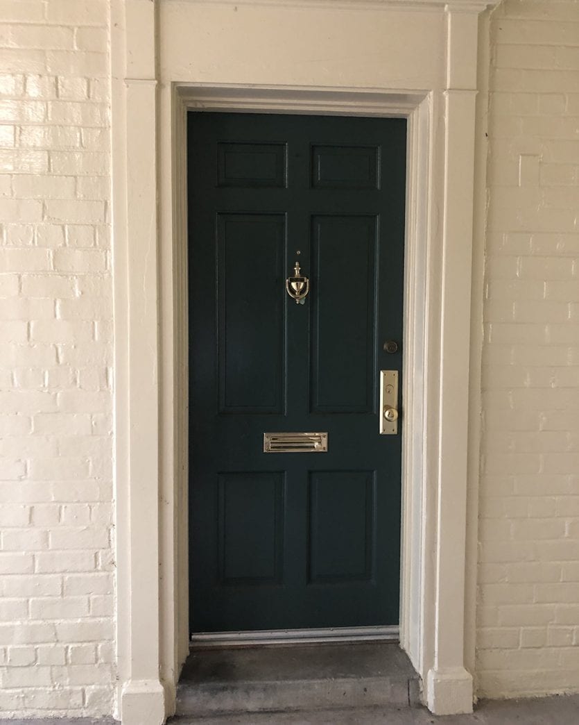 I have been binge-listening to your show since my friend introduced me two weeks ago. I have since bought a Ballard indoor/outdoor rug, the amazon dish towels (lol), and as an ode to our own french bulldog, the Mister French stone bulldog (may he rest in peace, sweet boy!!) thanks to your inspirations and stories! We recently moved from Birmingham to DC and sold our home that I renovated and decorated and are now renting in Alexandria. Since we’re renting, there isn’t much I can do to the inside and my furniture works well enough, but the outside just doesn’t feel like home. It’s a townhouse but the entrance is in a hallway and another door is across the hall. We have a lot of space and I feel like I could make it pretty using some planters and a cute welcome mat. My mom also gave me a wicker bar cart to use which I was thinking would be cute to switch out seasonally. Attached are some pictures of the space. The cart is white but I am thinking of painting it. I feel inspired to use color, and I’m leaning towards a purple or sladey-blue but would love your help with a color along with planter ideas. Also, would a wreath be overkill?