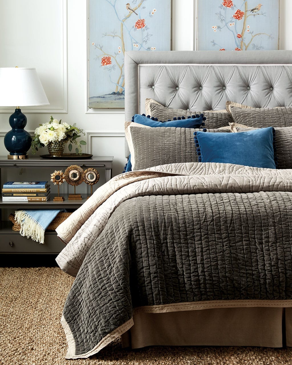 Play with feminine and masculine accents by using chinoiserie wall panels and dark gray velvet bedding