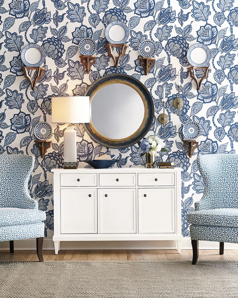 On the wall above, we played off the blue and white color palette or our favorite Bunny Williams Campbell House Dinnerware by displaying them on wooden wall brackets.