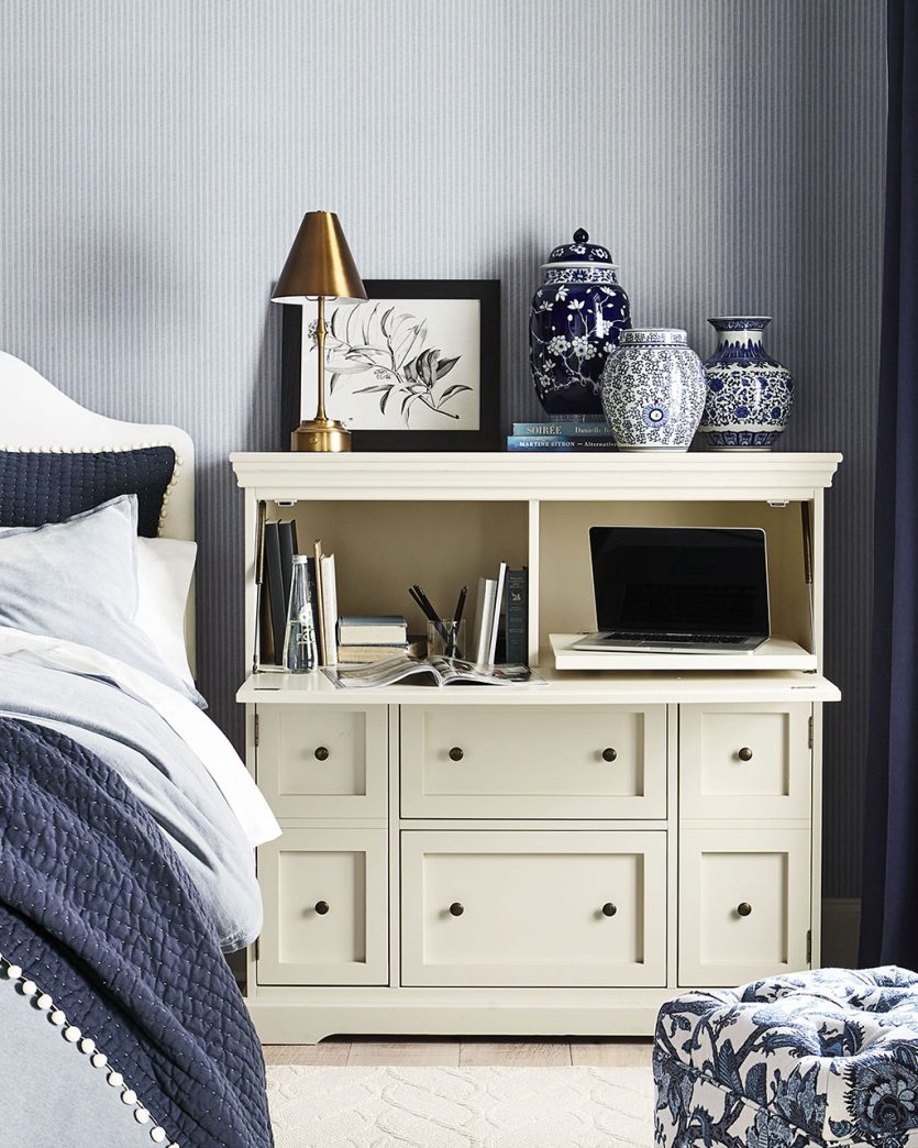 We’re big believers in making the most of your space, and there’s no reason you can’t make room for a working station even in a small space. Secretaries with fold-down surfaces are amazing multitaskers that can serve lots of purposes. Add one to your entryway as foyer storage, and fold-down the top for an instant workspace. Or add a secretary beside your bed as a nightstand.