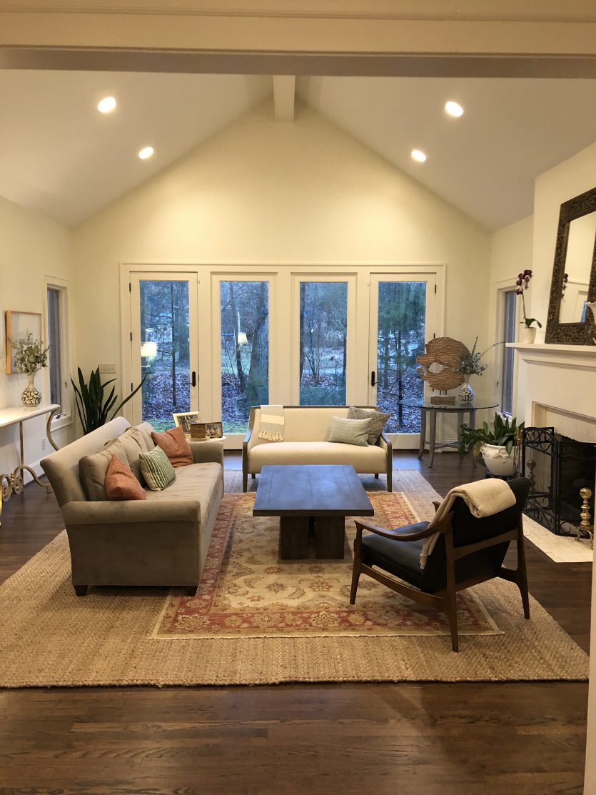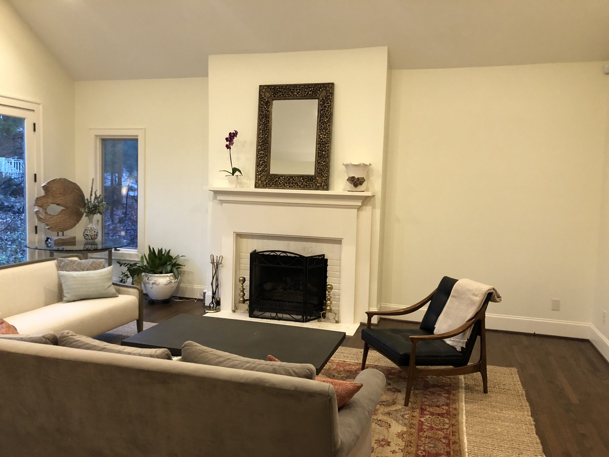 – What to do with the big space to the right of the fireplace? Built-ins? A huge piece of art? A bench?