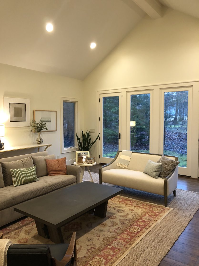 I’m hoping you can help me with our living room. We have a separate den and sun room, so this room is more a formal entertaining space. When you walk in the front door, there’s a nice sized foyer and then a big doorway into this space. As you can see, right now it’s sad and oatmeal-y. I’m hoping you can give me some direction on how to make it sing! My style is generally clean, neutral, inviting, comfortable.