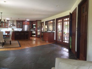 I have not gone through with painting the cabinets for a couple of reasons: 1) A couple of designers and lots of friends have said “don’t touch it!  It goes with the house” and 2) I am not sure if I need to paint ALL the reddish-brown wood.  Can I get away with painting the upper’s?  Or the perimeter cabinets?  My husband is opposed to changing out the expensive granite.  Also, the mahogany extends into the living room (see pic), which I’m ok with, so it would be nice to leave some mahogany in the dining portion of the space (base molding?).