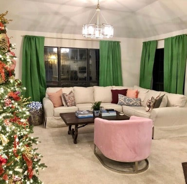 In my living room, I have a beige couch and dark wood coffee table on beige carpet. I like color so I bought the Ballard green linen curtains for my living room windows. The twist is I have a light pink velvet chair (from my old apartment) opposite the couch. My dilemma is that I can’t figure out how to make the bright green and pink make sense in a traditional style in the way that Matthew Carter can! Any advice? A picture is attached for visuals. (Having a hard time figuring out couch throw pillows in this space as you’ll see below.)