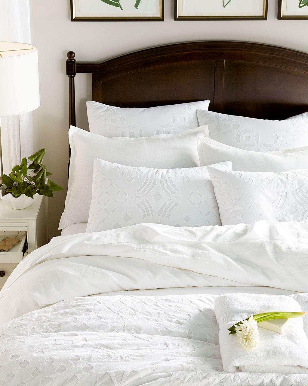 Inspired by Suzanne Kasler’s Southport Rattan collection, we designed a space that played up the tropical feel of these wicker pieces. Since the room is filled with woven furniture pieces and is anchored by a natural fiber rug, we knew we needed to make the bedding stand out. We chose Suzanne Kasler’s Eyelet Bedding to bring in the perfect amount of romance. The geometric floral pattern is cut and sewn entirely by hand for one-of-a-kind heirloom quality and really ties this tropical room together.