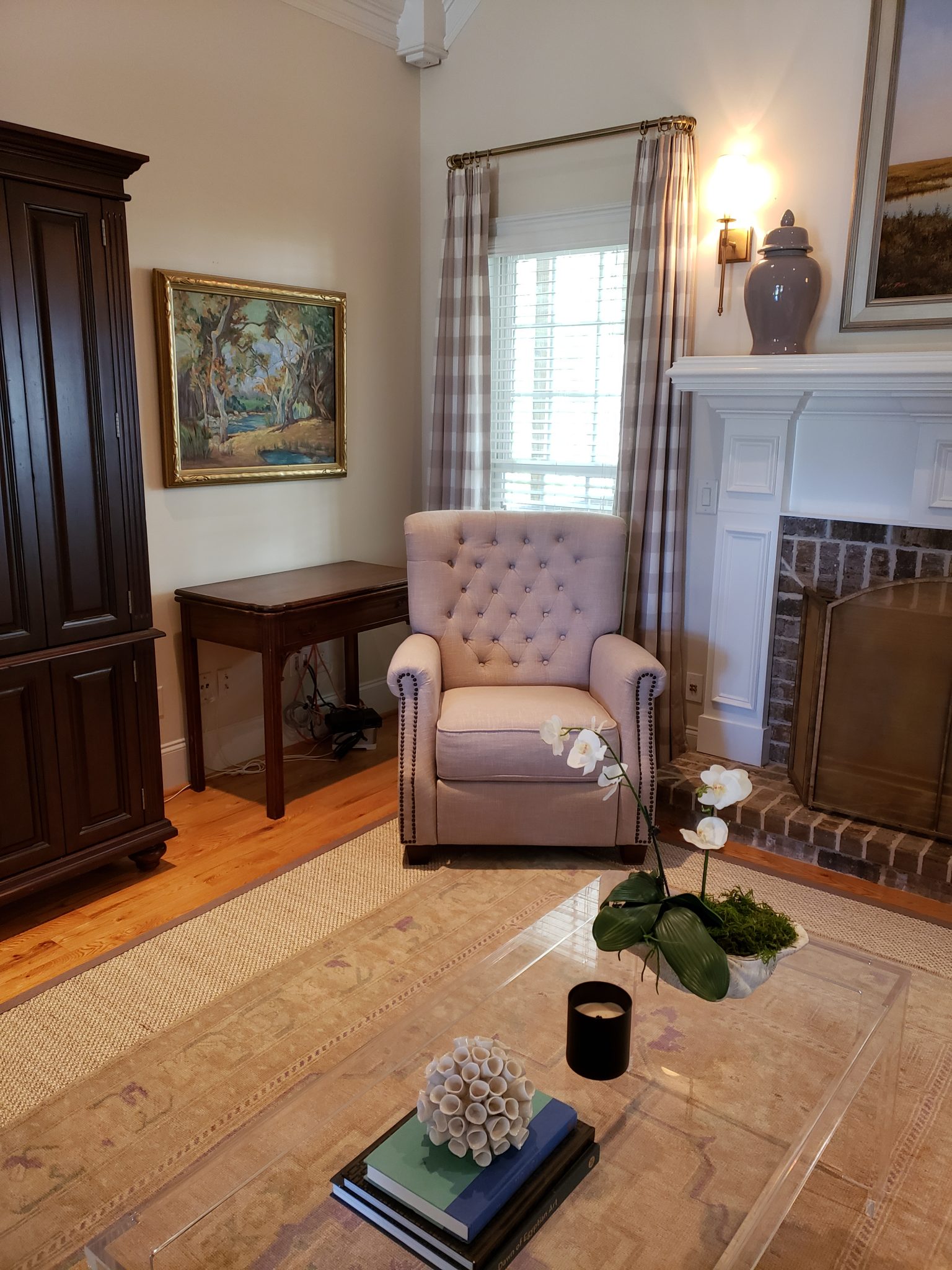 Love the idea of a lamp, chair, somewhere to put a drink and maybe an ottoman or footstool to prop feet! TOTALLY open to fun print, color or even the Bunny Williams faux fiddle leaf fig tree! Yall are the experts!