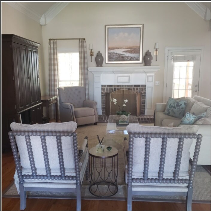 The corner is next to the Ballard Slim Chadwick in Tuscan brown. A window is also in this corner and I have a neutral buffalo check drapery panel. The fireplace is on the other side of the window in a brown and neutral brick with large white mantle and the gold fireplace screen is a Ballard outlet deal. I do have art there but again it can be moved!