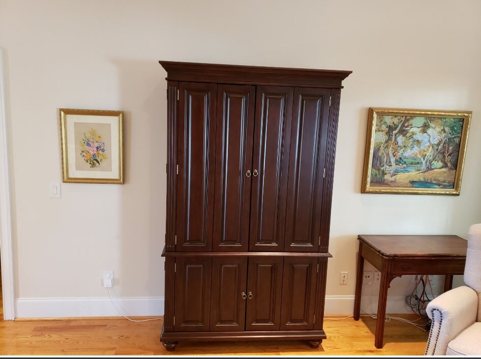 This is a good looking room, and you have done a great job of pulling it together thus far. The recliner and antique table can’t occupy that space, but we like the recliner so don’t want to see it go! You could find cabinets with doors that provide cord management. Adding some art and accessories with some black could add texture and depth, and the blue from the painting could also be used in a buffalo check pillow or another way to pop some color in. Some small tables could provide a place for drinks, and a nice floor lamp will add more lighting options. You have great style, so just a few final tweaks and you are good!