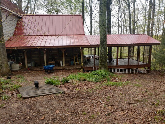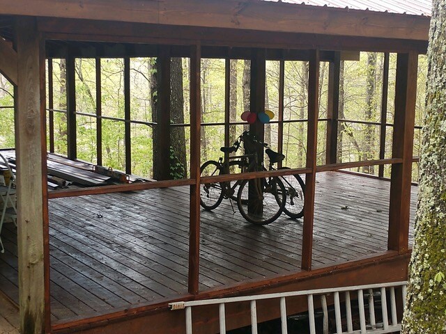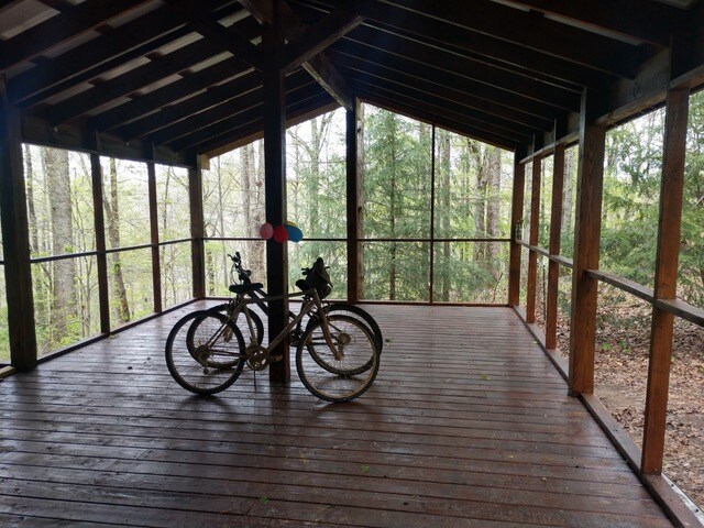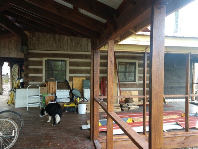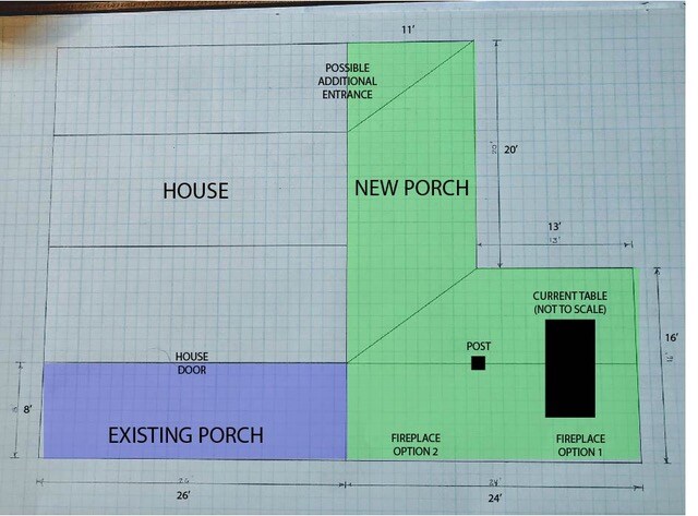 My husband’s parents are building an “L” shaped three season porch on their cabin in Middle Tennessee. As their children marry and grow their own families, they wanted a larger space for everyone to comfortably gather for a meal and for friends of their teenagers to come play games, string up hammocks for spending the night, and converse around a fire. They also host a Bible study group occasionally. They plan to add screens all around and maybe benches on the perimeter. The existing window in the kitchen will become a pass-through. My questions are about placement of the fireplace and general layout of furniture in the space.