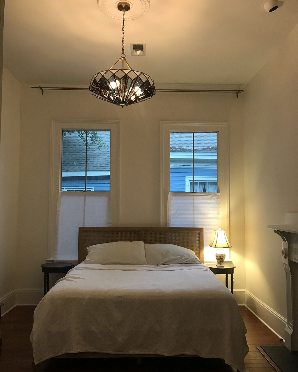 The intended look was the bed in front of the windows with chandelier (from Ballard, love it) above to be a dramatic focal point upon entering the room. However, the chandelier is not centered to the windows/bed and the windows are not centered to the back wall. I THINK this will not matter much once I have drapes, rug, lamps, and artwork in the room but if I need to move things around I want to do it before I purchase those things as that will change what I need.