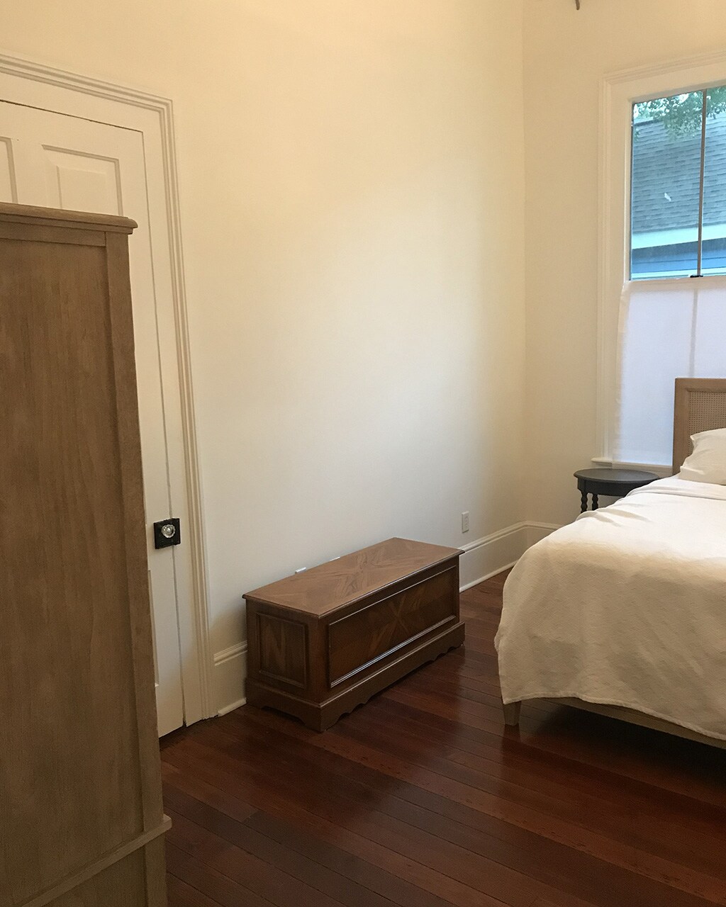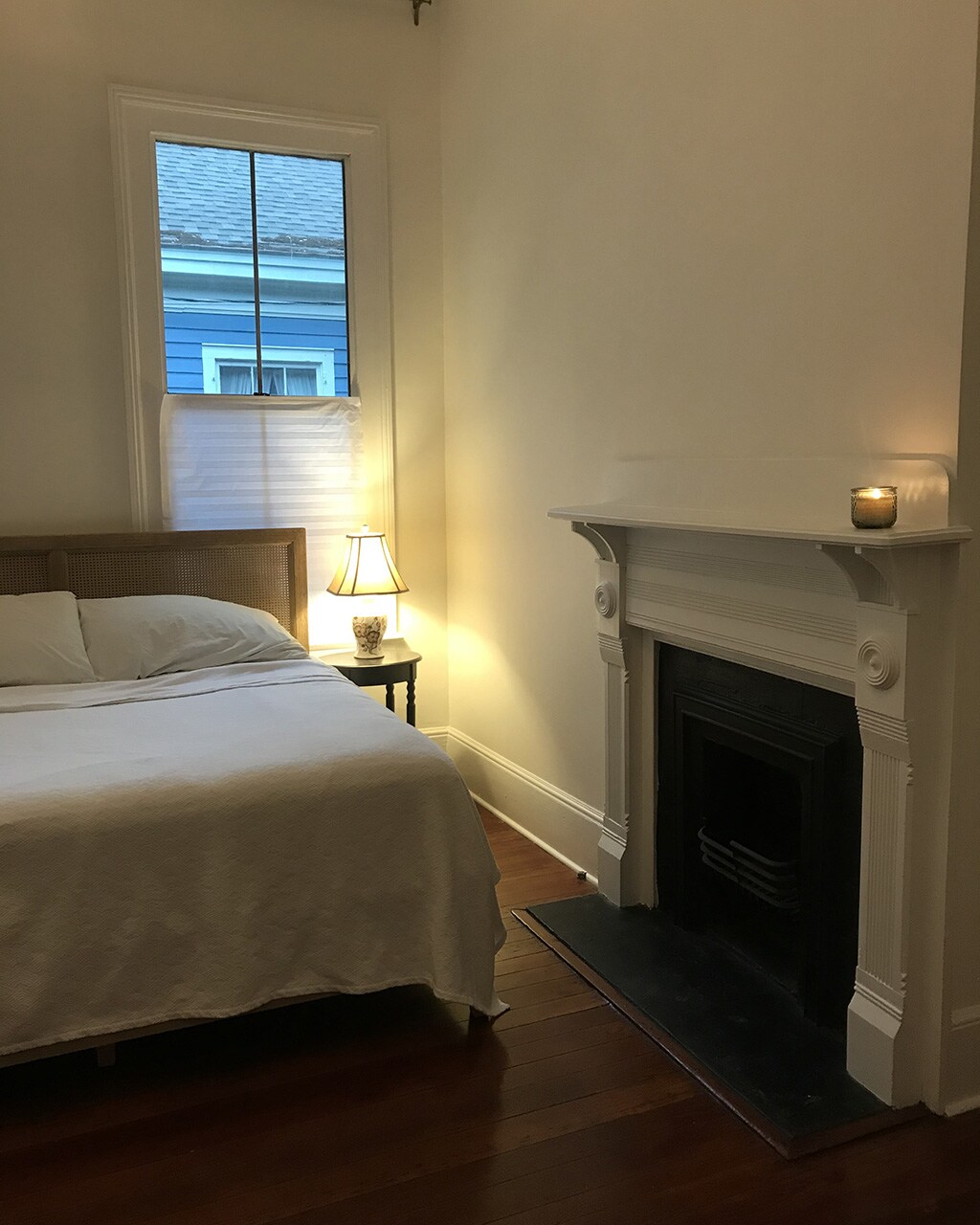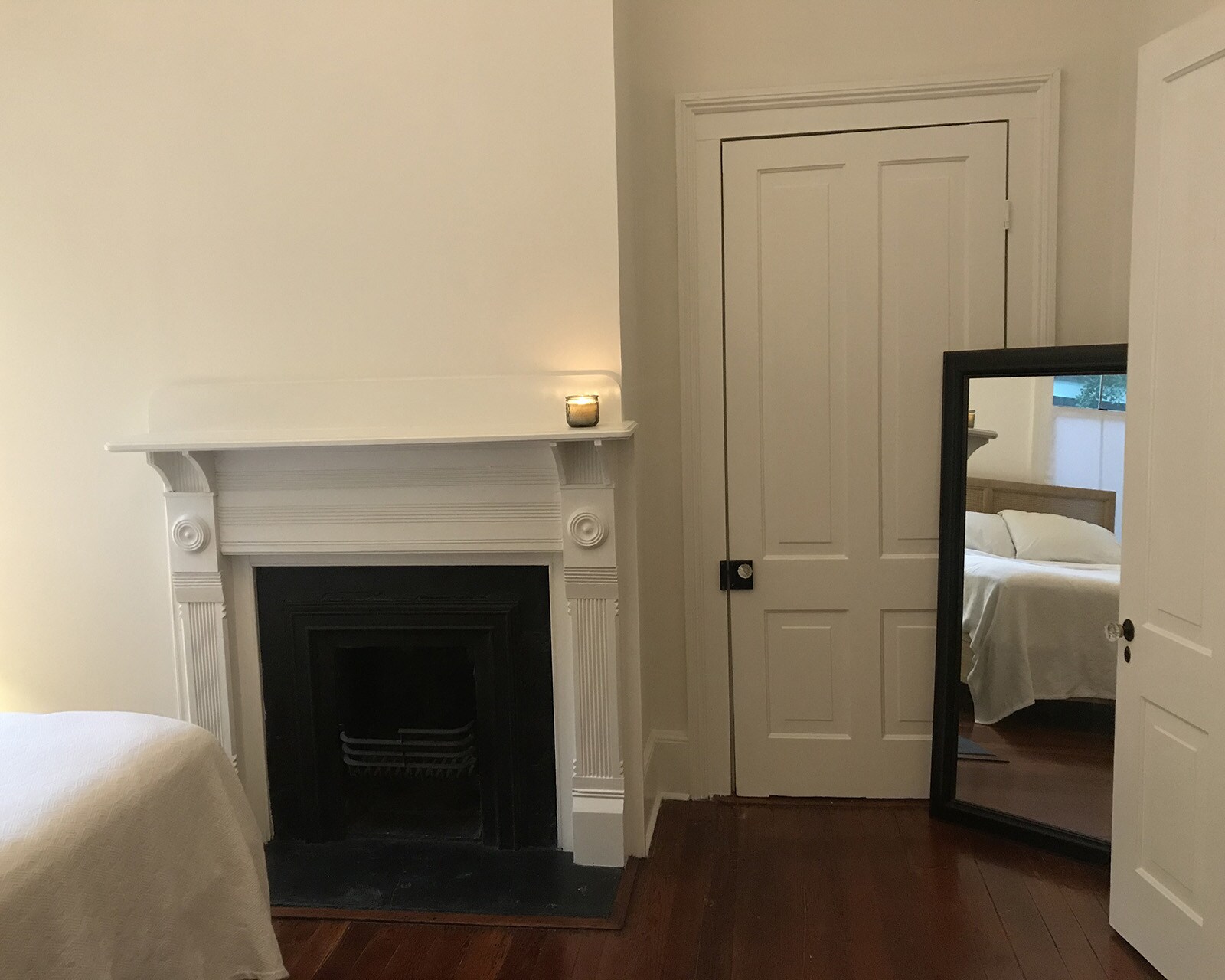 The other layout option is to put the bed with headboard to the left wall and foot towards the fireplace (fireplace does not work so no worries about space around it). This is a functional layout but less pretty/dramatic.