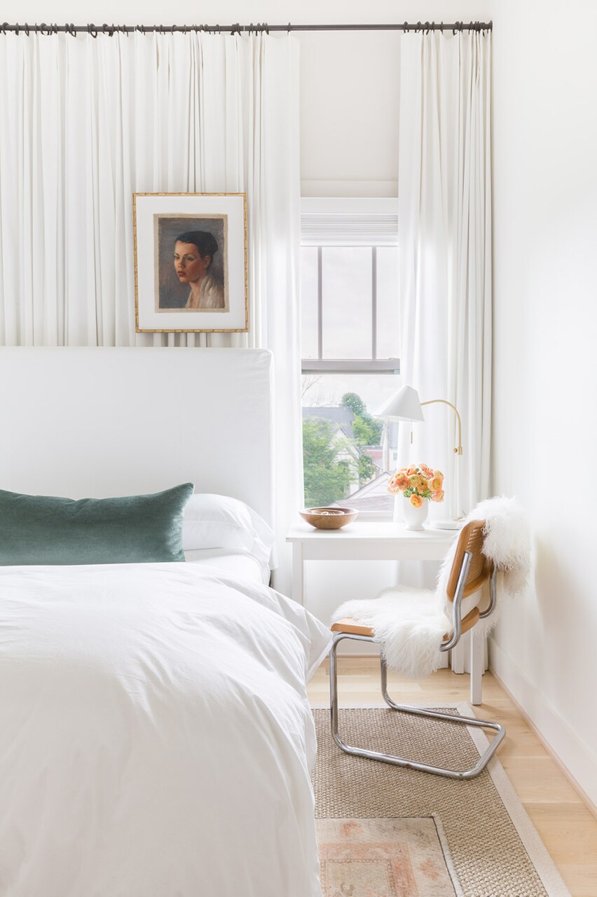We’d also suggest checking out Lauren Liess; a designer in Washington, DC that specializes in this style house and uses an earthy, 7os color palette in a really modern way. Consider investing in your art collection. You have a lot of blank walls, so find something very large to make an impact here. It doesn’t need to be expensive! I know you have a lot of windows, but 2-3 pieces above the TV, flanking the windows, above the bar or above the dresser could be great places. Think outside the box! I also with giant ceilings like this you could get some great, large light fixtures. We’re not sure about painting the brick around fireplace; start with painting the room one color first.