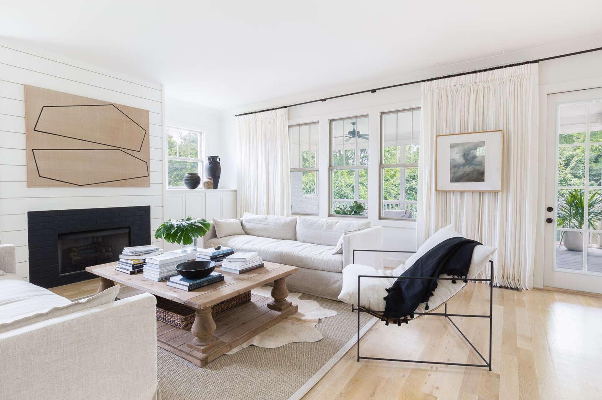 I think this is a really great open space. I would love for it to all be one color and be light, bright, open and airy to reflect all the windows in the house. We all agree that statement walls need to be very intentional and think white walls with white trim in a different sheen will work wonders. I think this will be the biggest bang for your buck then you can bring in in textures and layered accessories within the same tonal family. Use art for pops of color. You can really change the meaning of this room by bringing the furniture in closer to the fireplace. Adding another chair and maybe a little card table would be good because this is a great room for people to gather. Add some more lamps with the plants on that table behind that long sofa, as well.