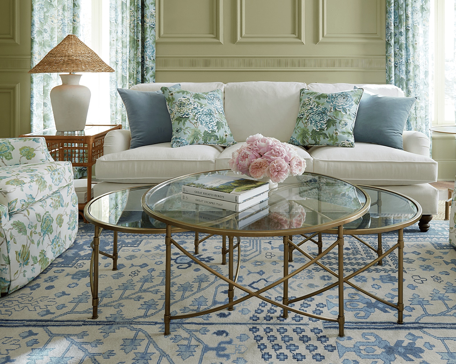 In the living room above, we’ve added lots of small accents of blue—pillows on the couch, lampshades, and trim on the curtains. Pull small items from other areas of your home and use them all in the same space to make a big impact.