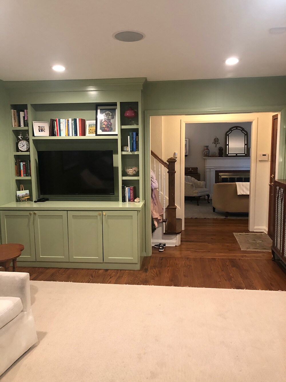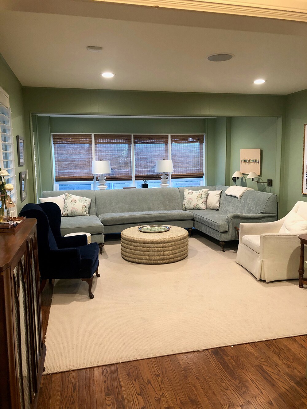 We love the idea of bringing in the pink, but with the color palette that you have we need to bring something to tie it in. The first option would be to incorporate a fun wallpaper on the ceiling that had some of these colors to bring it all together. Maybe something in pink with a micropattern. We thought maybe it would be nice to add one more swivel chairs that had a pretty back so you can see that right when you walk in but also be able to turn them around to watch television. We have even done something where we have upholstered the back of the chair in a different fabric that is a little more playful and the seat is more durable. Rather than having all of the furniture on the outside of the room, the swivel chairs will help pull it in and engage that space. Another option if you didn’t want to go the wallpaper route is to paint the ceiling a little bit of a softer green than what’s on the walls so it feels like a more uniform envelope of color. We love the idea of a stripe on the rug. Also something in a pretty neutral, like a seagrass rug, would be nice. Then you could even layer on top of it with a more colorful or patterned rug to anchor the seating space. That one can be much smaller and cozier, and the bottom rug would stretch more towards the walls. To touch on the blue chair, the shape is really interesting but since you have so many lighter colors in the room you could reupholster this one to fit better with the room. It would be nice to even add a little footstool or side table.
