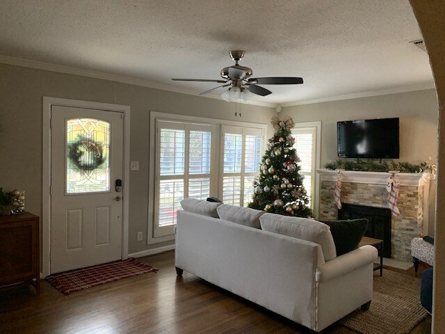 In terms of the living room layout, I would probably not float the sofa and instead move it back against the window. If you had any other chairs you could mirror the sofa. Sofa on the left, keep your fireplace in the center, and chairs on the right, and maybe some lower items like ottomans can float around in the middle. If there is no room to do that idea, you could add floor lamps on each side of the sofa. I definitely think the room needs more lighting. I’m not sure of the dimensions, but you could always use the Ballard Room Planner to map it out. I would probably move the shelving unit completely to the door wall along with the basket you have next to it. You could put some art above the basket or take it out completely and put an ottoman or leave a place for shoes. I would rearrange the shelves, so they aren’t all full, add some pretty elements, and adjust the books so some of them are horizontal. The console I would move to the wall where the etagere bookshelf is—just swap them!