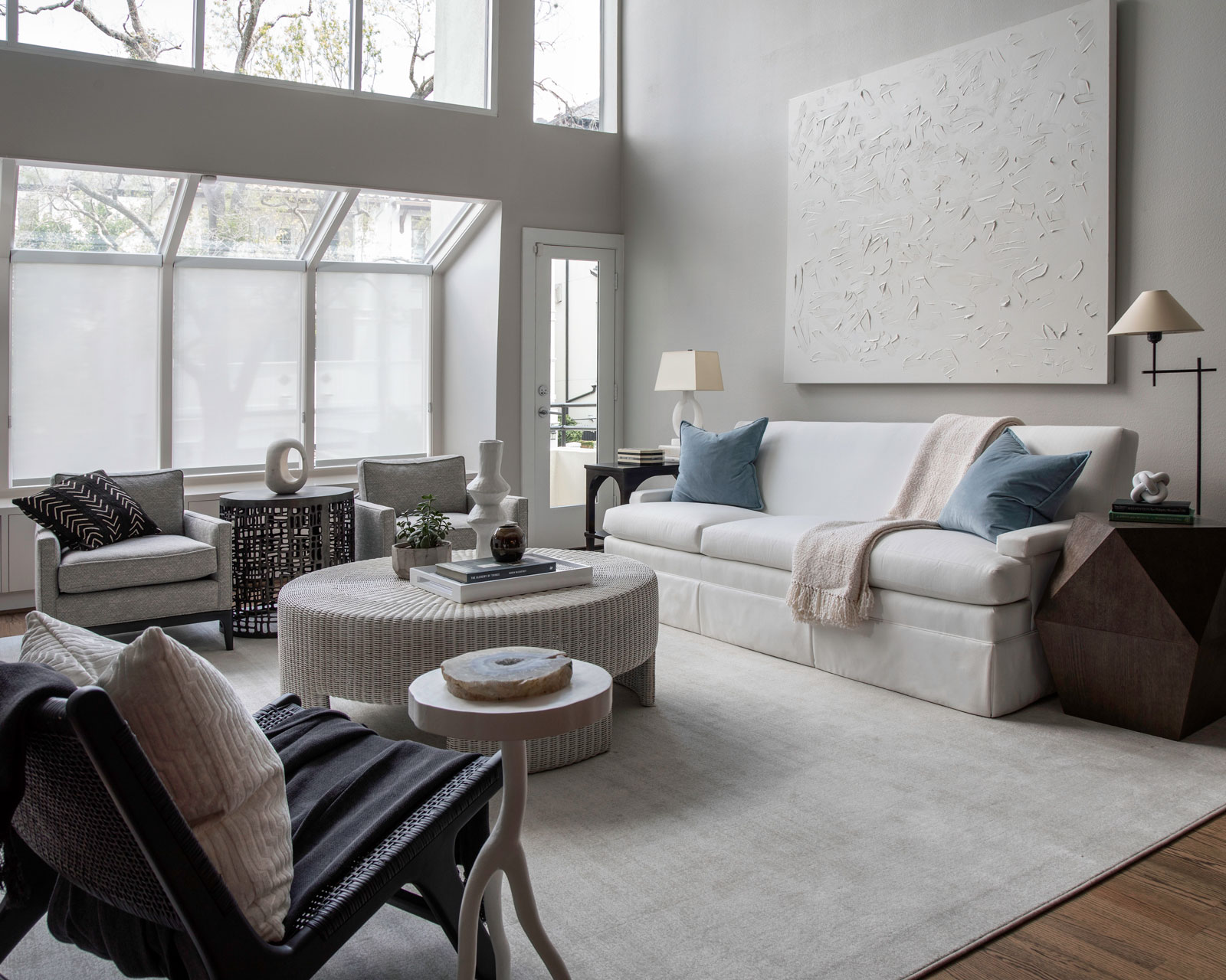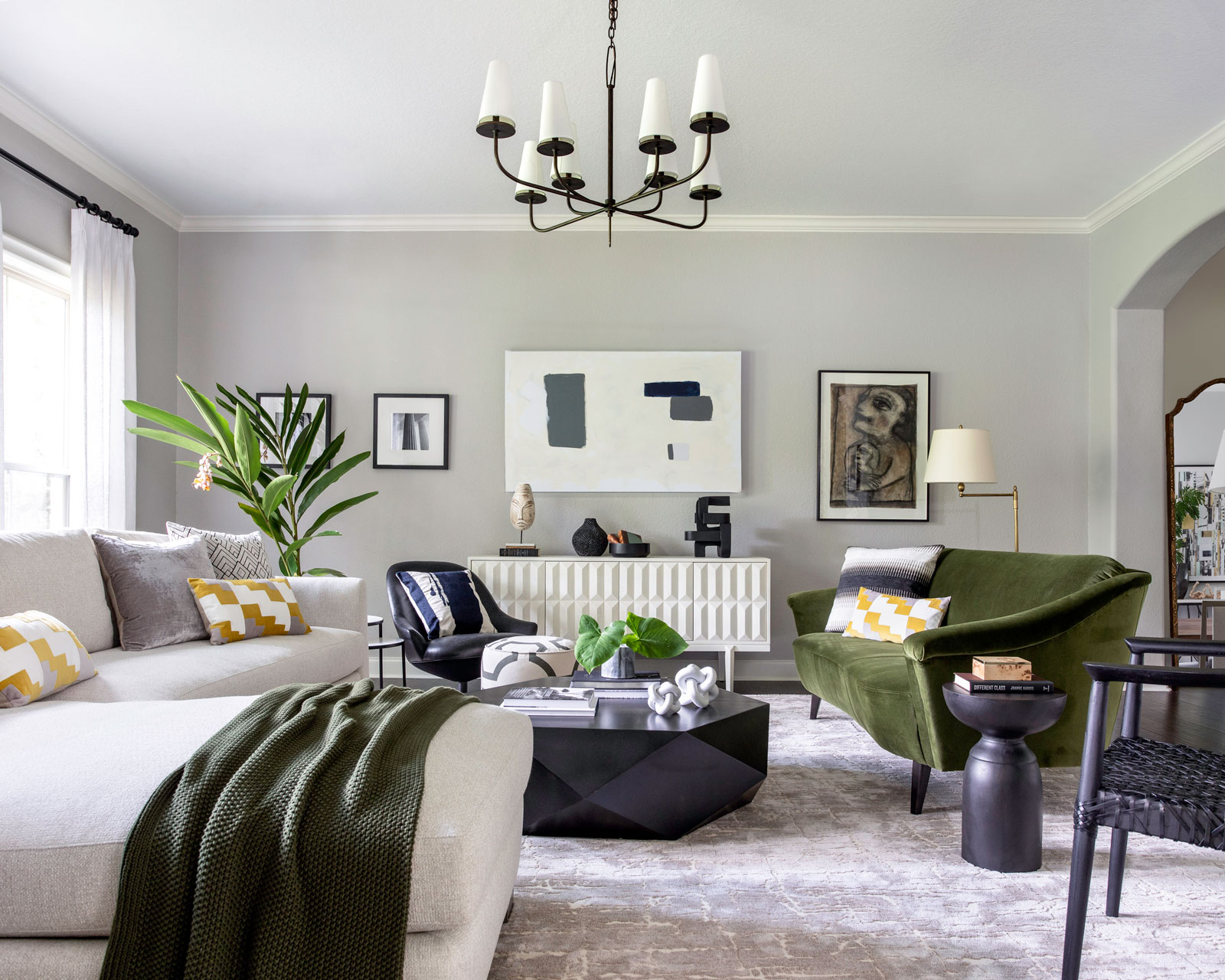Even though we talked a lot about finding your best white paint color in this episode, Jacob doesn’t think white would be best here. A pale greige would be a good place to start. Check out Sherwin Williams Agreeable Gray for a starter idea! We think moving the desk to where the table is facing the window could be a great idea and less boxed in. A square or rectangle table would be best, or maybe a banquette to go with the table you’ve already got, but not a round or oval table. A navy wall could feel neutral and not too much with some larger art on the long wall. As far as your coffee table, if it serves a function such as storage or a space to eat, then we can keep it. If not, you may want three different-sized tables for drinks instead!