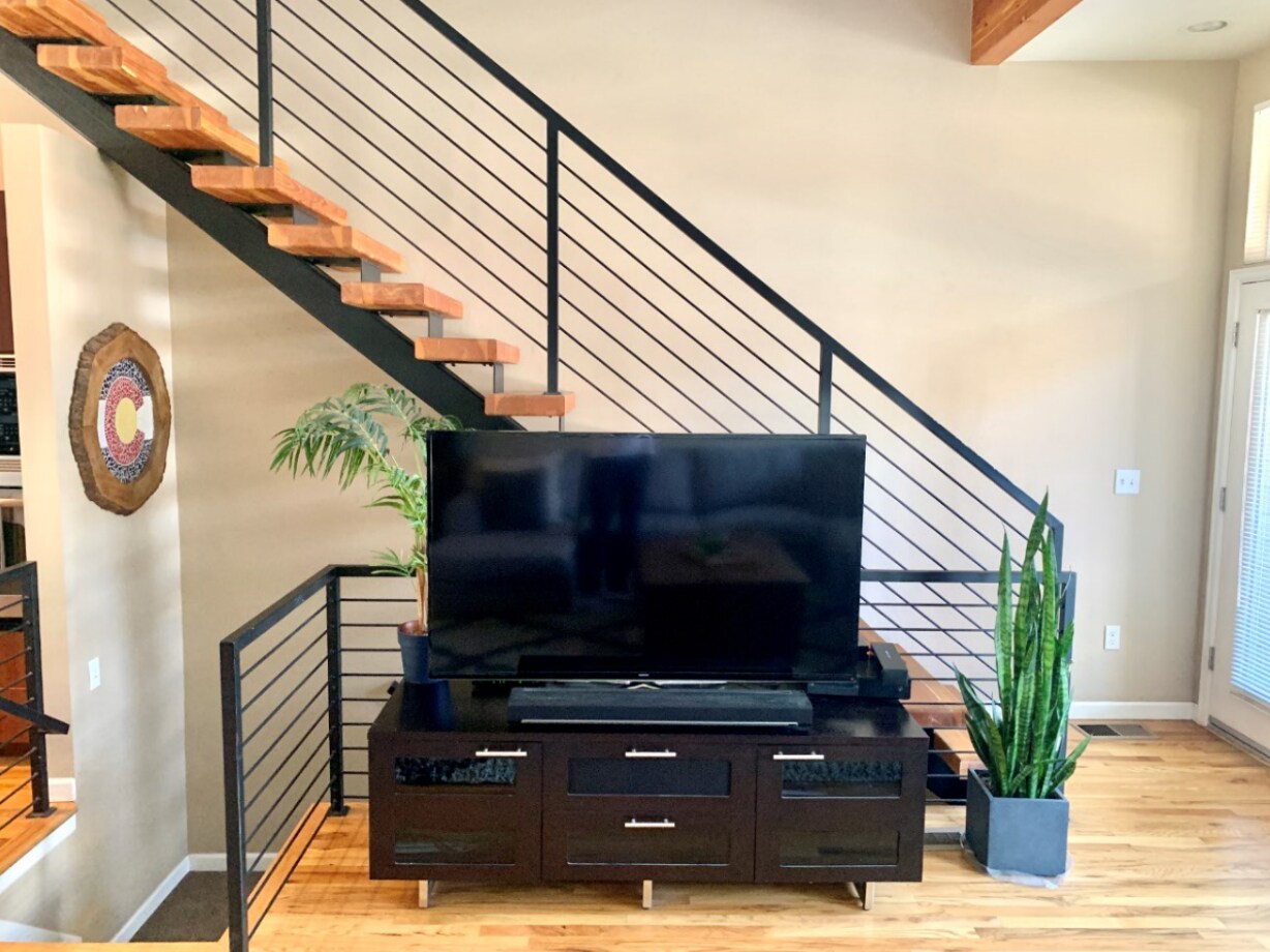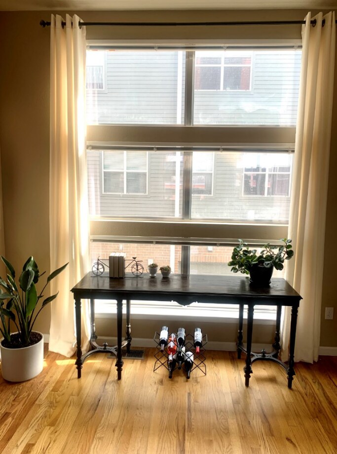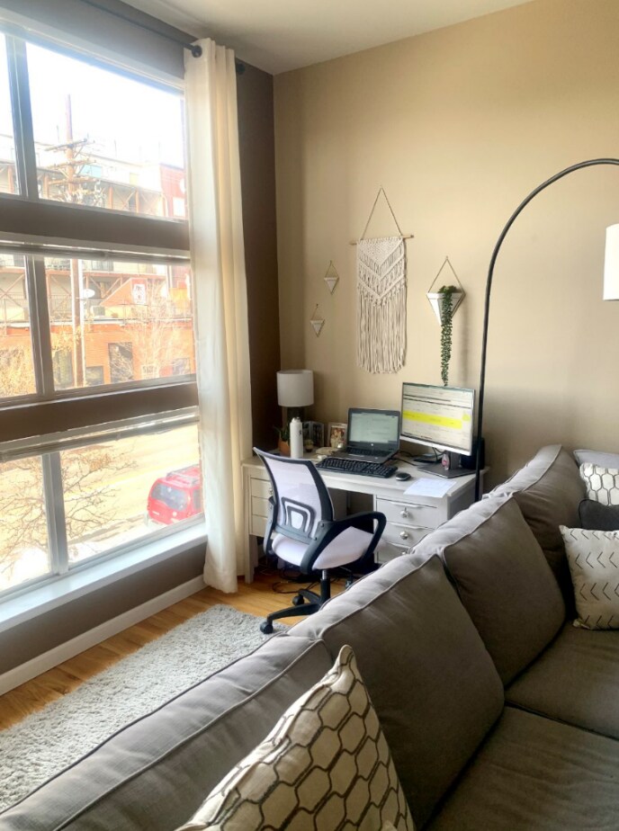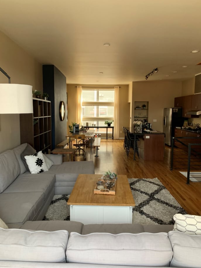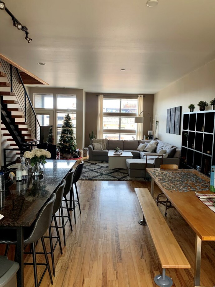 I live with my boyfriend in a row home in the city. It’s about 12 years old, 3 levels, long and semi-narrow. When you come in the front door you immediately go upstairs to the main area which is multi-purpose: I work from home at the desk in the corner, it’s where we watch tv, gather with friends, eat meals and cook. It’s the heart of our home and I need advice on how to break up the room into distinct areas while tying it all together with one cohesive design. I’m going for contemporary/ a little industrial.