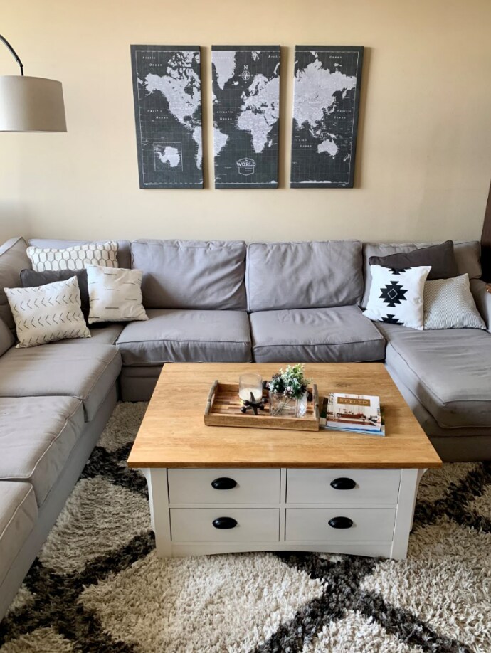 The caveat is this isn’t our forever home, so I want to make updates without doing a complete remodel (if I did, the kitchen cabinets and countertops would be first). I am planning on painting, buying a new rug, coffee table and a new smaller kitchen table that is either round or square to go on the far end opposite the couch.