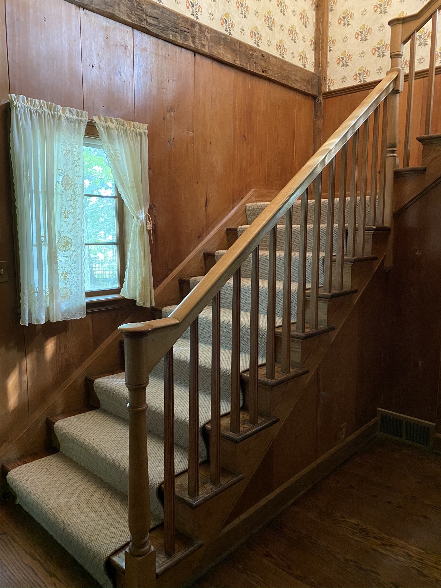 The front hall and stairwell in this house are especially challenging for us given how much wood there is. There are original posts and beams visible as well as some heart of pine paneling on the walls and there is a wide beadboard paneling going up the stairs. Plus, the floors are oak.