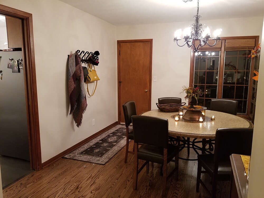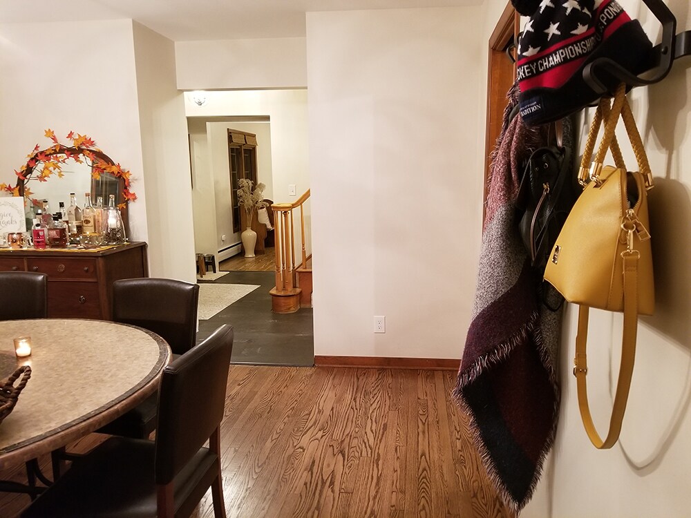 My husband and I are new homeowners and my decorating dilemma is the fact that our dining room is also the entrance to our garage. I am trying to figure out how to create a functional mudroom-type area but also make it pretty to blend with the dining room furniture. Please help! And feel free to critique anything else that jumps out at you in my pics, I love to hear your advice and visions for the rooms you discuss 🙂 Thank you so much!