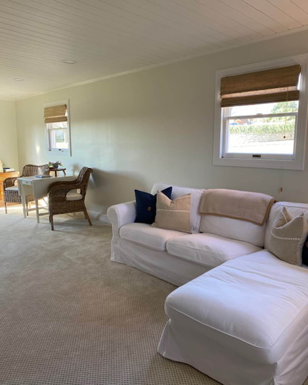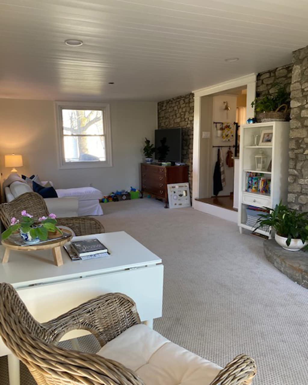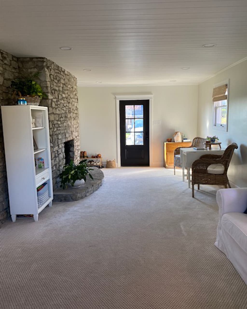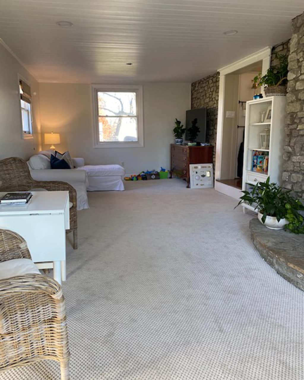 The biggest dilemma we have is with a space that is a converted carport, which we recently recently remodeled. This was previously our dining room, but we find it more useful as a living room since it is the only room in our home with carpet and we have a 1-year-old. The room is long and narrow, and the floor does slope down slightly toward the door (#convertedcarport). As you will see, we went light and bright with the paint and carpet, since there is one entire wall of stone (former exterior wall) and this room felt like a dungeon pre-renovation. It is truly a blank slate, as the furniture was just moved from our previous living space and is honestly past due for replacing. This is the main entrance to our home, so we need an “entry moment” close to the door to drop bags, shoes and jackets and also some sort of larger rug/runner for wiping feet since the room is carpeted. I fought hard for another flooring option but with the sloped floors it is really the only thing that works. We also use this room for TV watching and it is a gathering place when we have company. I would love to maximize the potential of this space, so any suggestions for furniture pieces (sectional? swivel chairs?) and placement would be great! Also, I need an overhead light fixture for the “living area” and am wondering if I should add drapery to the windows, in addition to the woven roman shades.