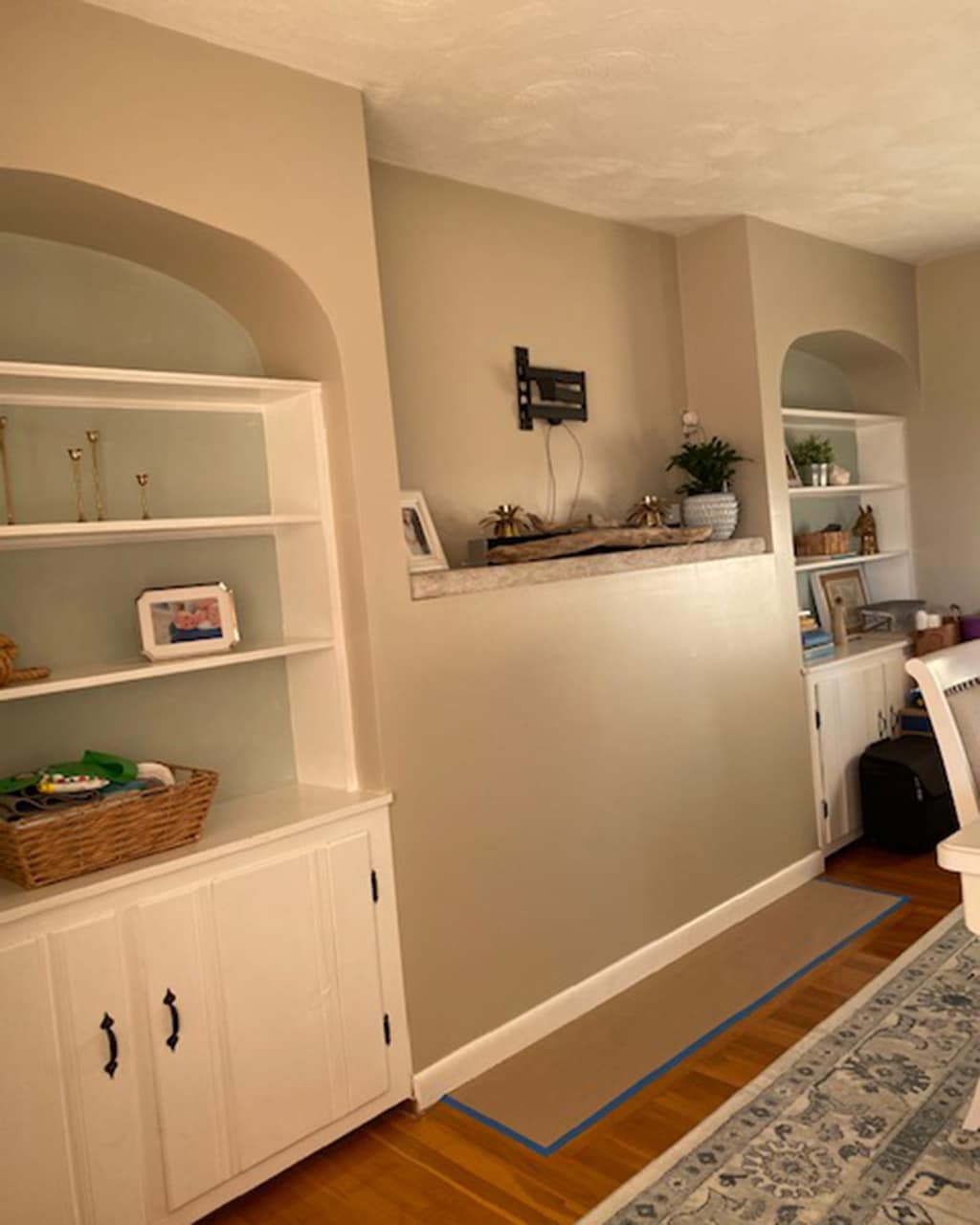 If you’re still with me, I have also attached pictures of our former living space, now dining space. We have a wall that used to house a fireplace with the still existing built ins on either side. I think we need to open the wall back up and at the very least have a firebox with logs stacked inside, even if it isn’t functional. Also, I am wanting to get a console or buffet for the empty wall to the right of the door. Also need a light fixture for this space ASAP!
