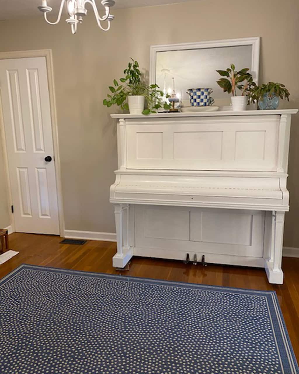 You may be able to move the piano from the entryway to where you were thinking of putting the console, but you’d really have to look at space planning first. The other little thing is moving that entry rug to be centered to the room and under the piano.